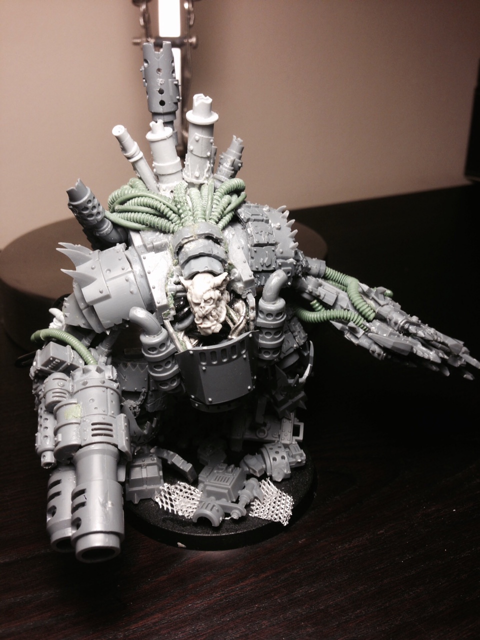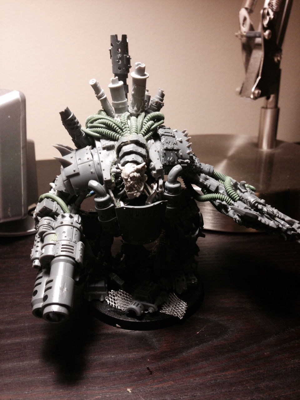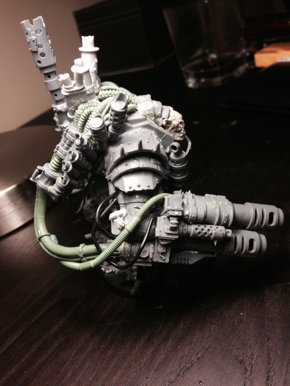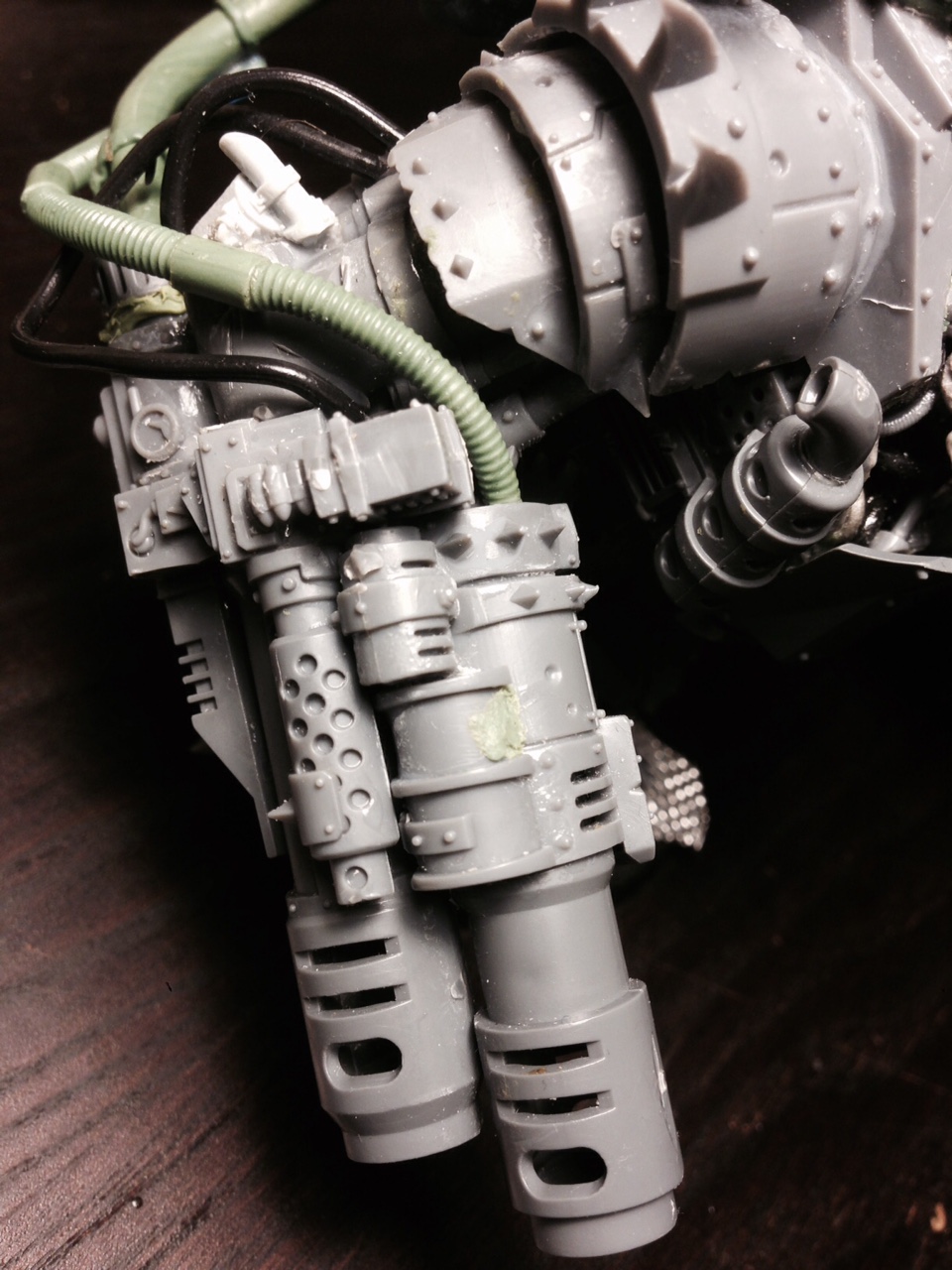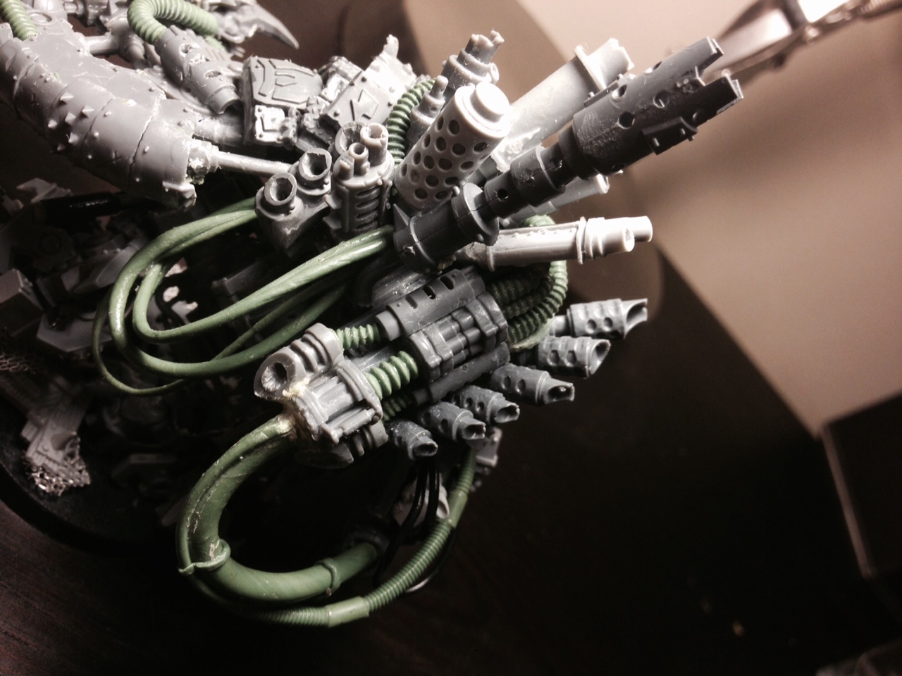 [img]hed it and it changed the way I did the model's neck...which then changed how I did the right-side of the back. But I did start with the right side first. Per the theme, I knew I needed something that looked a little bit more practical and I ended up buying the engine/exhaust pieces from the Morkanaut on ebay. It gives the model a nice fin-looking set of exhaust pipes that cascade in a way that fits with the theme of the right part of the model. After I incorporated the tube system coming from the neck carapace I needed to beef up his right engine to keep the whole thing looking even, so I took some Imp. Guard bits that I think are supposed to be ammo cylinders and positioned and modeled them with green stuff pipes so that it looks like this crude but relatively well-made piece of Ork tech.