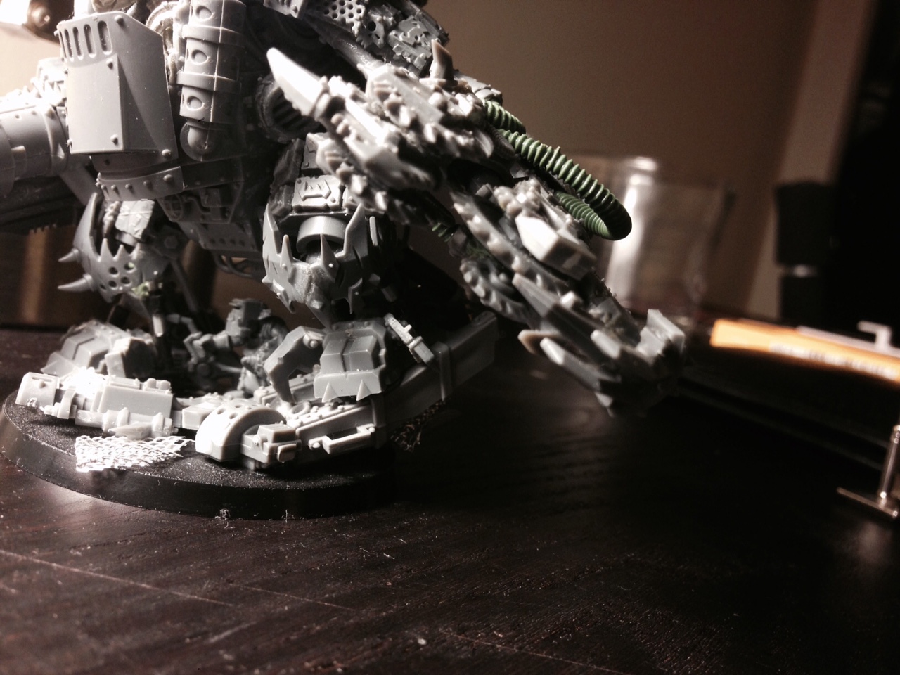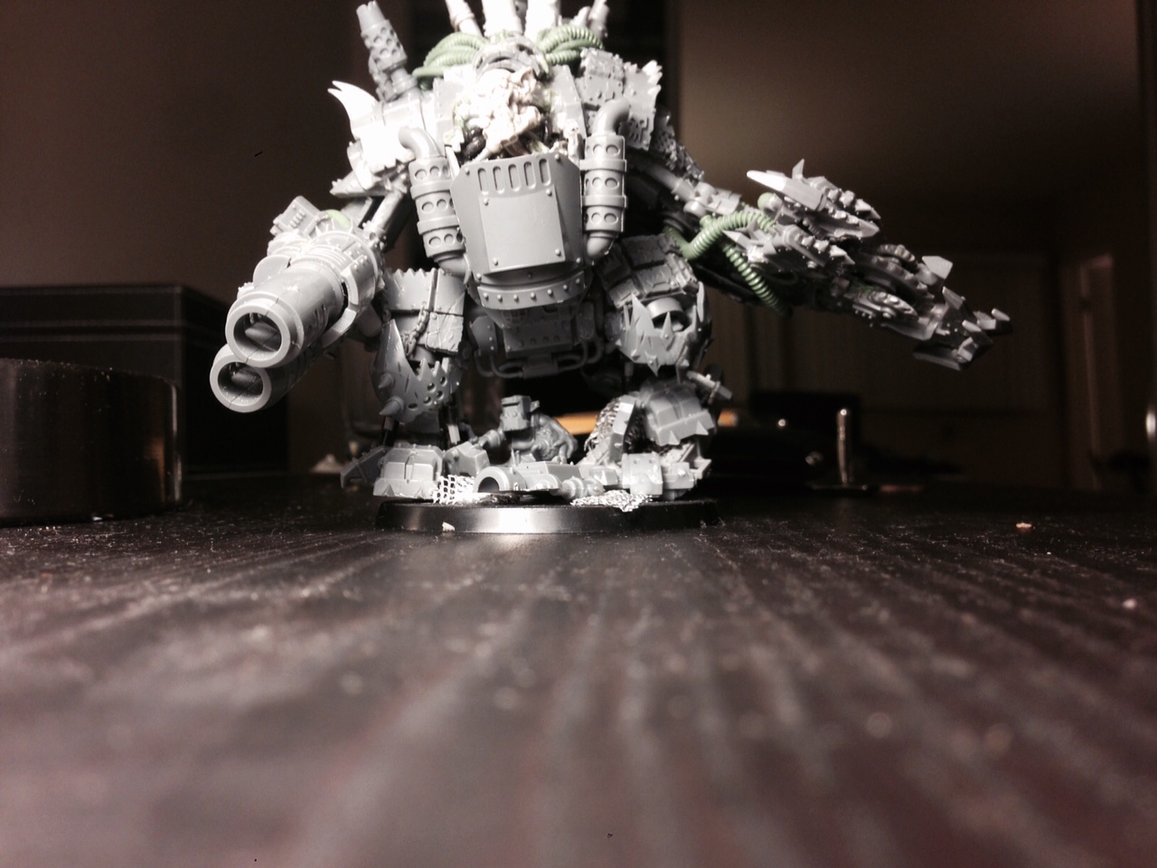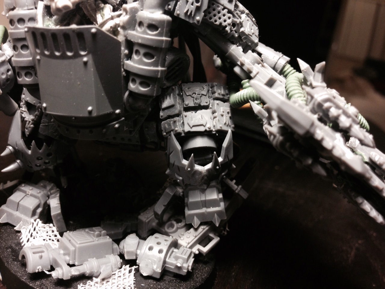 I had originally settled on a much lamer head and neck set-up until my brother and friend both kept suggesting that it needed to be beefed up a bit. I then made the neck carapace from Ork Boyz shoulder pads, then figured I was good. Then after I had put the engine section together I got the idea for an awesome cluster of pipes and cables coming from the end of the carapace and into the engine. Aesthetically I love it, and it also makes him look like even though he is the biggest Ork bad-ass, it is taking EVERYTHING to hold him together.