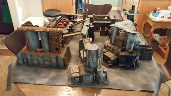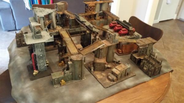 There are a bunch of work in progress pics of the terrain in my gallery. You should be able to get an idea of the pieces there. Probably too many random things to list, but the primary pieces are necromunda bulk heads, GW manufactorum kits, Micro Art Shantytown kits, Pegasus chemical plant technobridges and then a bunch of cut up cardboard poster tubes, styrene and foam.