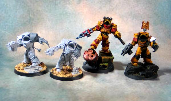 2: Thin down Averland Sunset with water (I use distilled water), and give the marines several thin coats, so that the result will be smooth and not clump or cover details.