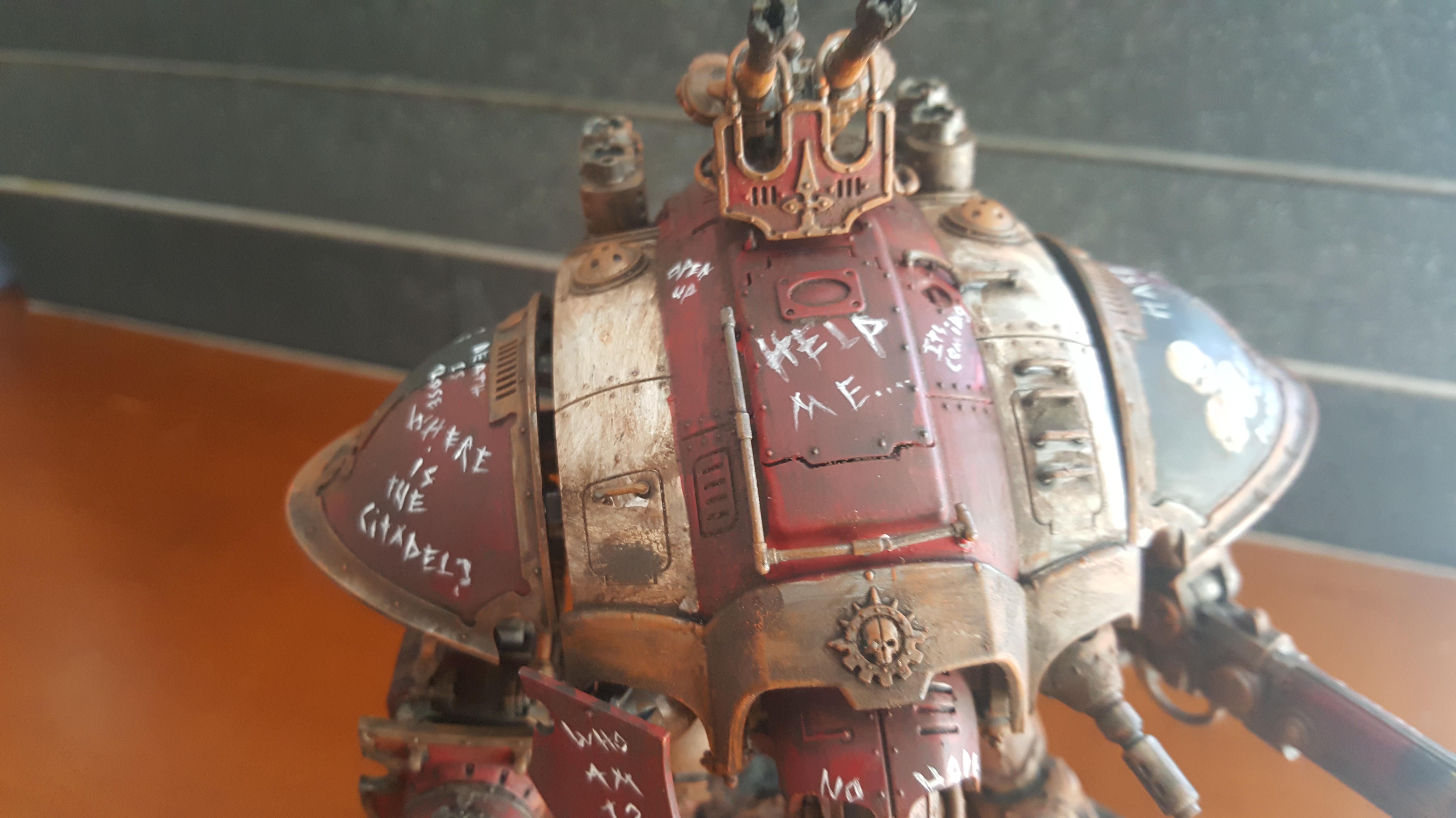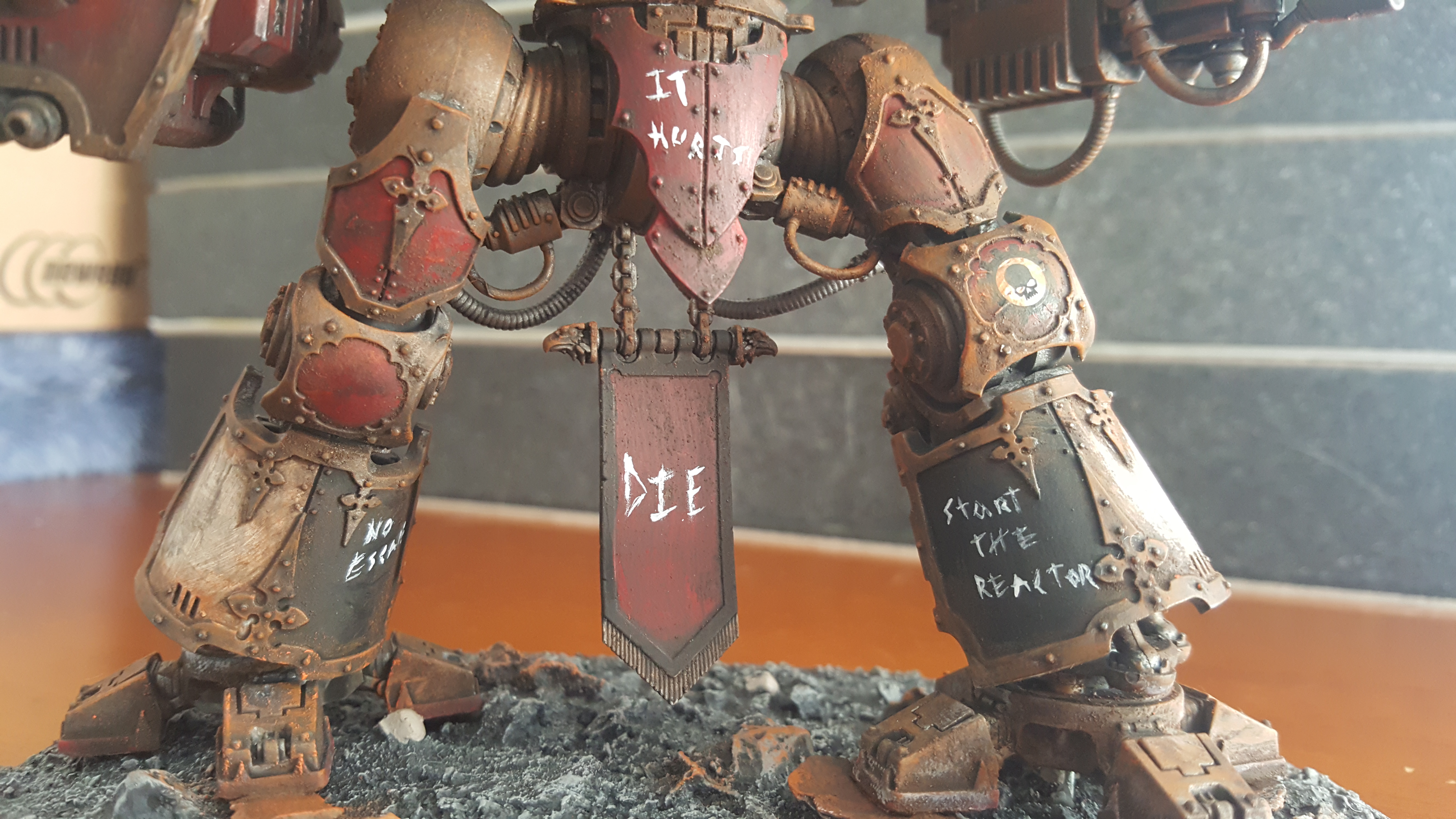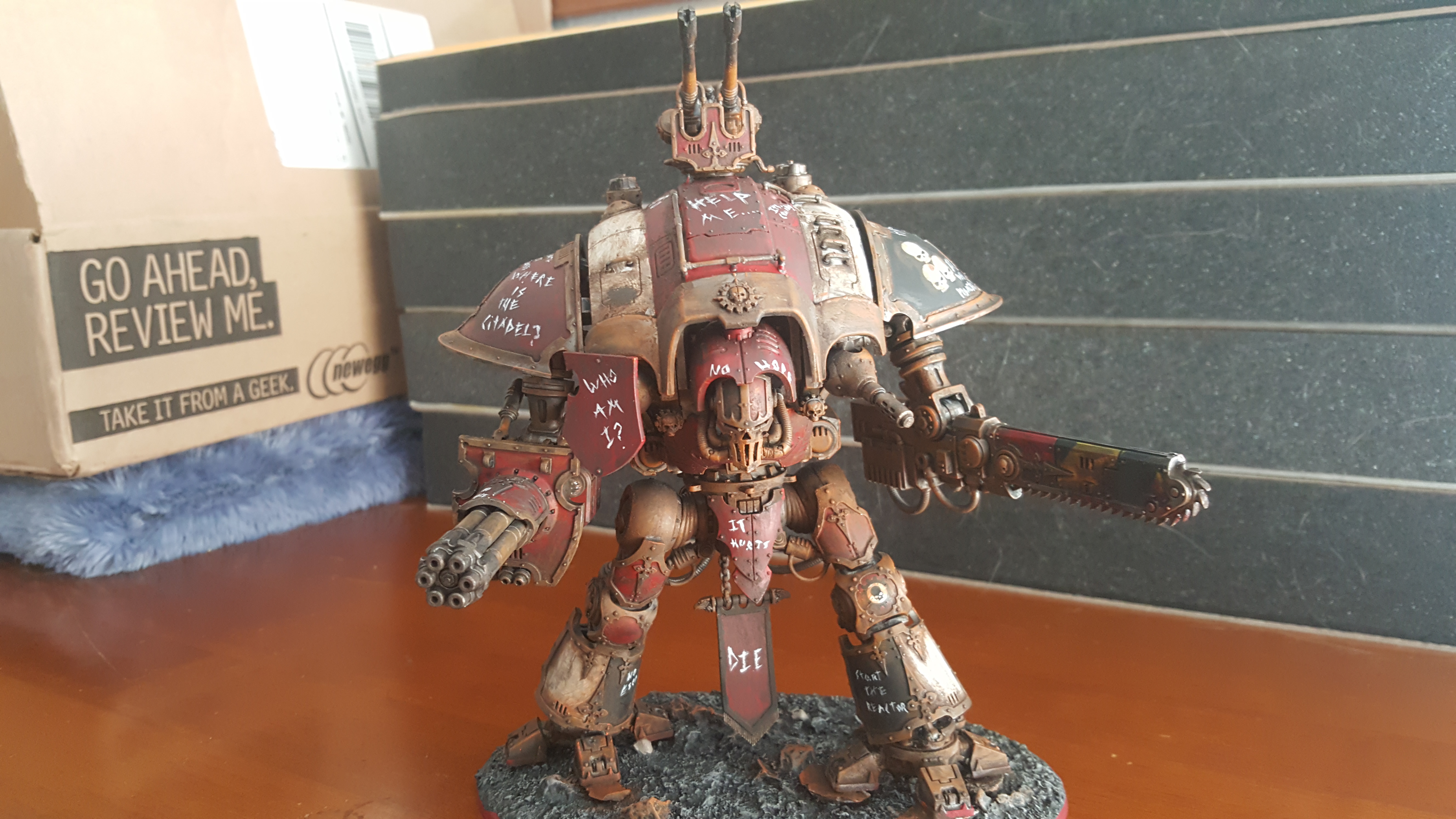 Really cool concept, I like the thought of an Imperial Knight going crazy and turning to chaos, love it. Has given me some ideas for my own RKs. Bought the Renegade Knight boxset a few months back and still got the 2 to build and Chaosify.