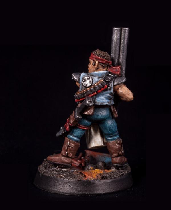 Thanks. Yes he is. I'm trying to have a fair amount of variety in the gang, so there's diversity in skin tone, and hair colour. I figured that they're not an organised military so the clothing would vary too, so while the basic colours are the same, and the red bandannas have the same recipe, the jeans are different blue tones, the boots are a mix of black and brown etc.