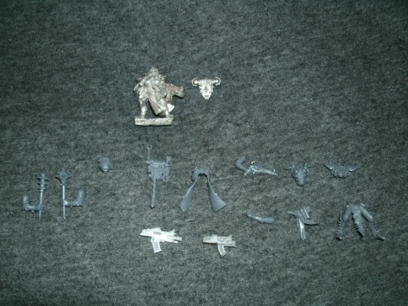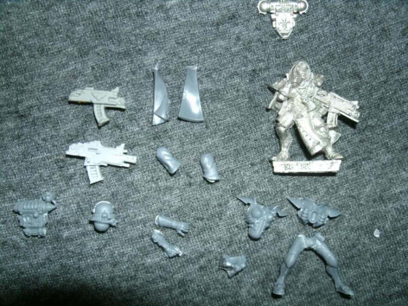 So these are all the parts I used. Legs, arms and torso from a Dark Eldar; arms from an Empire Flagellant; chest plate, backpack and helmet from a Skitarius; a Forge World boltgun and an old 2nd Edition Space Marine boltgun.