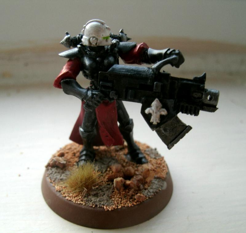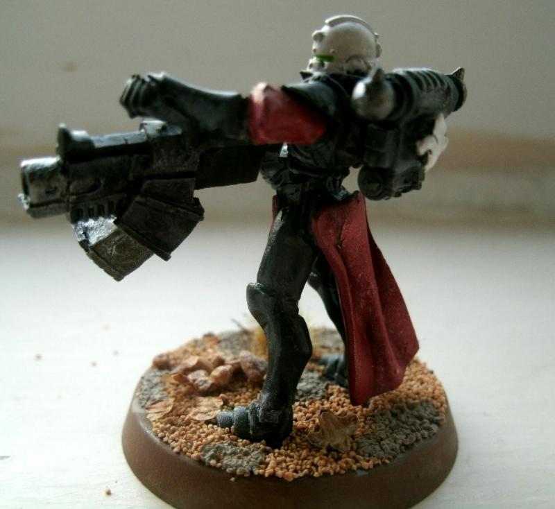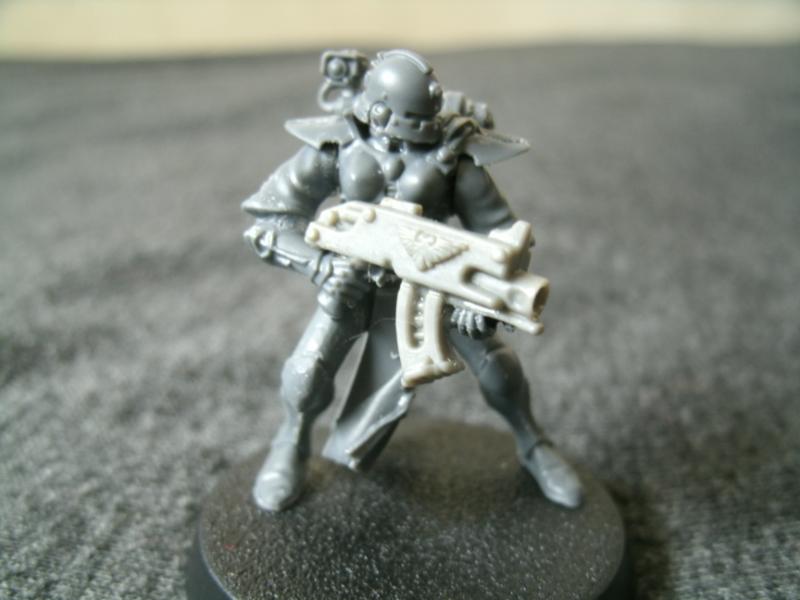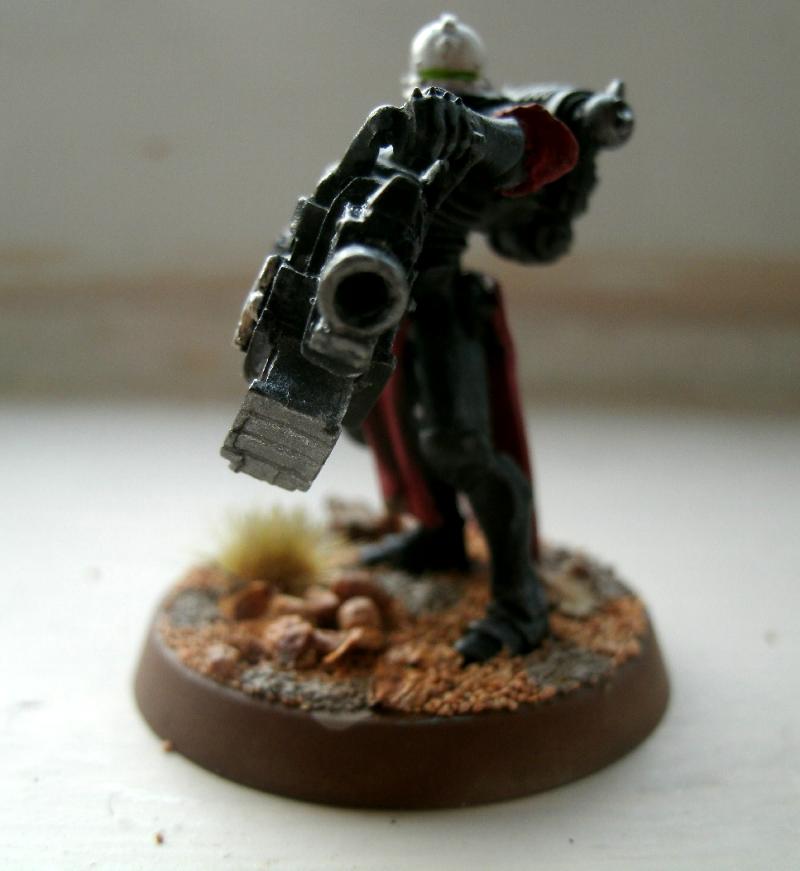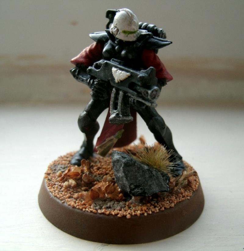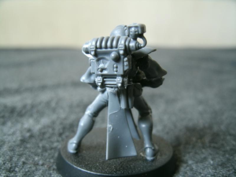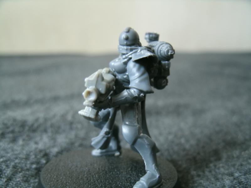 I filed and sliced away the detail on the Dark Eldar legs and added the flappy bits from the Skitarius chest to make the tabard. I used the sleeves from the Flagellant and the gauntlets from the Dark Eldar. The Skitarius backpack was chopped down and the helmet was huge so I chopped off all of the respirator and a bit off the back to make it fit. I opted for the old boltgun as the Forge World version was just too big.