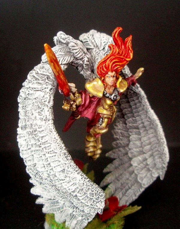 St. Celestine has a sword I painted flaming, and angelic wings. I painted her to have gold armor.