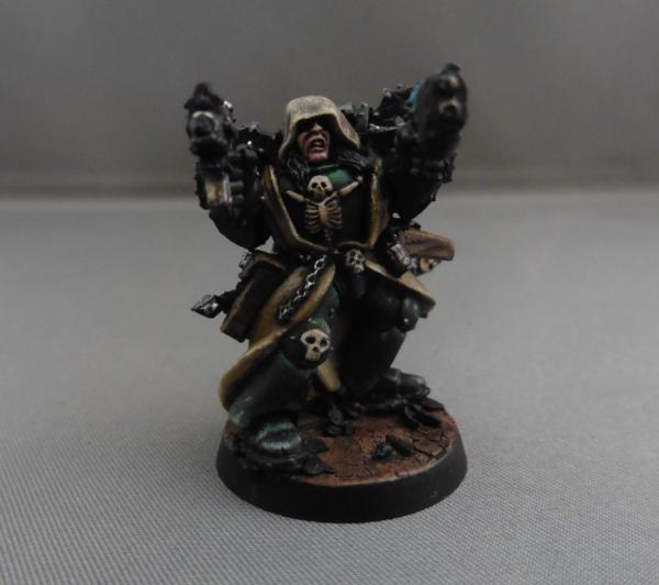 On the base? That's Agrellan Earth with a few washes over it. I love that stuff. I didn't use any technical paints on the miniature itself, but I did use Vallejo's Smokey Ink, which is such an amazing, versatile paint that it seems like cheating. It's a dirty brown colour with a slightly gritty finish. Thin it down and wash it over your metallics and they look really nicely old and weathered. Use it on leather and it gives an aged but still slightly gloss look. It looks effective painted on vehicles as a grimey line running down from any bolts and things that would have had oil on them. I used it on the cloak as well as the leather pouches. Then there was a lot of messing about trying to get a sort of sackcloth textured look on the hood.