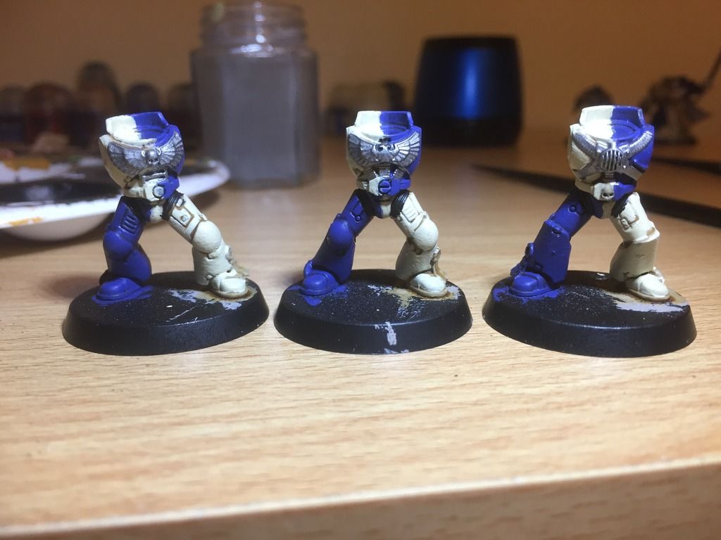 I came up with Novamarines! For those who don't know, this is an Ultramarine successor chapter which has a quartered colour scheme...blue and white/bone (I have seen both), I've personally gone for bone as its more interesting than just plain white.
