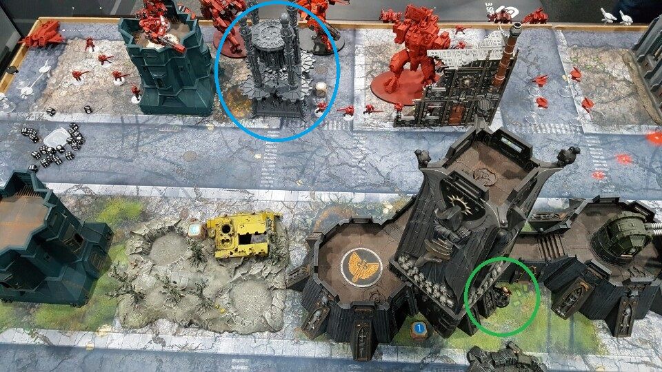 The building inside the blue circle is the Void Shield Generators. The Tau army clustered heaviest firepower platforms(Riptides, Stormsurge) around the Generator.