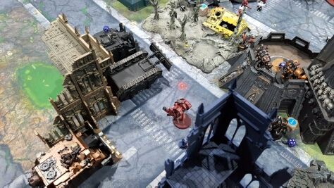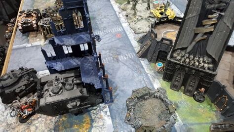 Leaving a wrecked land raider behind, the embarked centurions move forward to hide behind the building in the centre.