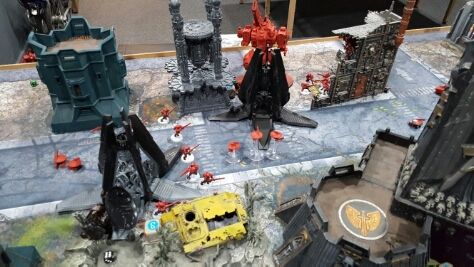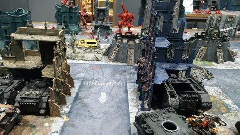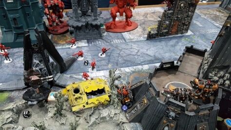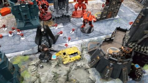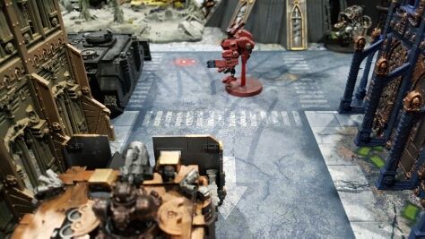 A lucky crisis suit lands in the midst of Iron Hands vehicles, and fires both fusion blasters at vindicator squadron.