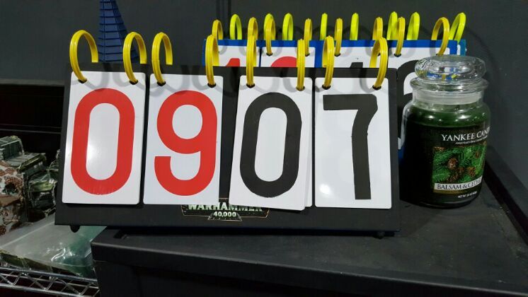 Scores at the end of turn 2. Red numbers show Tau player's scores, while the black numbers are Iron Hands player's scores.