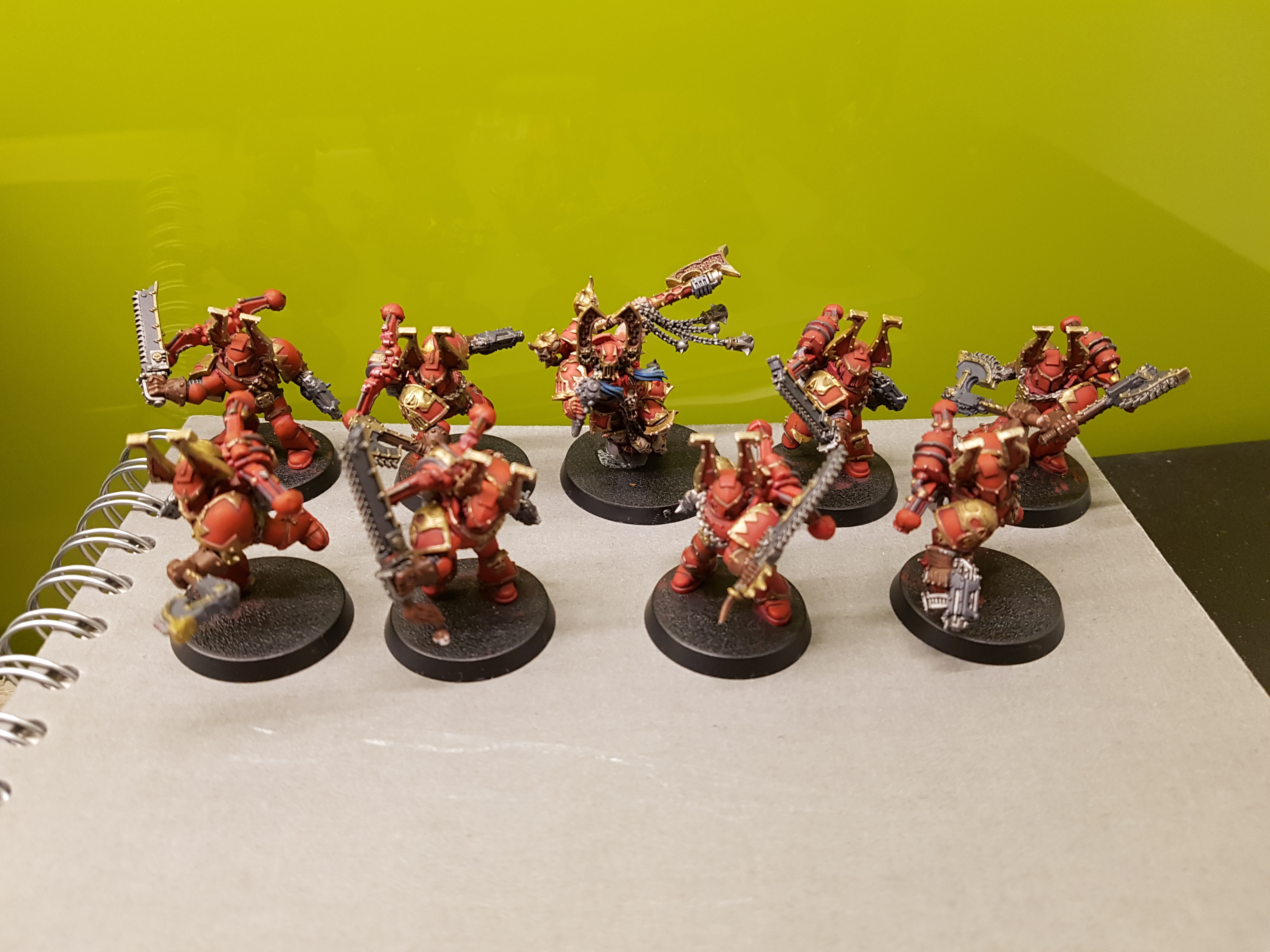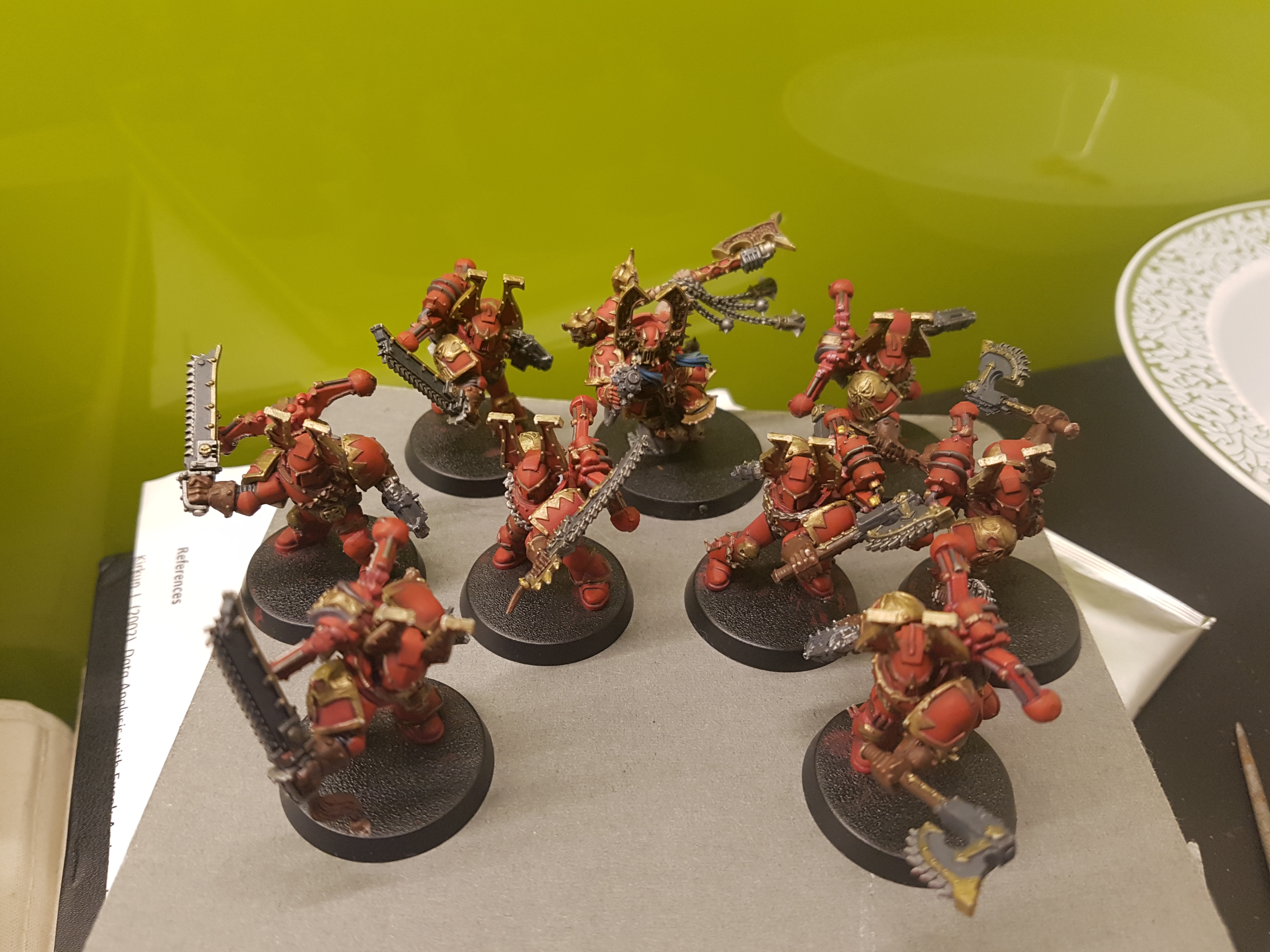 so these guys are only 75% of the way there for details and a couple more coats on shoulder pads for a bit of fade downwards then orange and another damper had to get a bit brown because of white primer... and kharne's gun and skully bits on his headpiece and axe need to be brought slightly towards brass... man, red is tough. figured brush control after seeing how many screaming skull layers covers ink spills on primed tau suits but MUCH still left to cover with brushes. haven't done a yellow or blue army painted some stealers with purp, tau scrskull, DA green, and khorne for my first go with red proper. cba for airbrush because id only get it out for priming and highlights and ill prob only have enough models for that to be worthwhile once I'm deep into a job. also, some of the before poses were lost because of whichever join being slightly off and I just wanted to get through more poses. probably redid every single one like 2.5 times and some of them I'm not too pleased with, so will be getting another 2 zerkboxes. title is for the drone about the berzerkers kit tasting too raw of bacawnbattawn with cunned up fawskin lazy much? I almost don't want GW to release a bzkrs revamp to spite you lazies. time enough to dredge them out of the 2d metals and keep them with pumpkin heads. 4 variations on 4 pieces (legs arms heads shoulders) (who counts packs as different anyway) gives you 256 variations without accounting for posing variations. great kit. hopefully new berzerkers are V much like the firewarriors revamp if ever done with basically a cleanup and nothing else. if they do some weird shoulder gak to make joins invisible (I know, prob fine cos marine torso with pads)... not a huge fan of the baroquegasm they've had the past lil while either. the scale doesn't suit baroque detailing, or so I thought, til kharne landed on the table and now the elves hands can have some respite from the plastic cane. still, new ksons could have done with fade to a slightly darker turquoise and drenched the metal in agrax. also, people saying Kharne is weird shoulderbarging, lol do you imagine...? but to save those nads, have you ever seen someone walk or drawn a convincing picture? they prob do 8 second multi fatalities videos with 2 second runups and pick a pose a second into it. kharne looks like hes about to, quite gracefully by being efficient, buttram a falling drop pod back into orbit with anything with a maimed groin held together by its collar bone. back to it, probably succeeded with only a quarter or a third of the poses. fortunately have old kharne on the way as well to see if he blends nicer. New Kharne looks too 2016, though this could be because I gave him an orange layer under the final damper with normal zerks only on evil sunz. duck you red... got hounds, cultists and bikes in the wardrobe unopened and will pick up 3 rhinos for 1750, maybe 3 termicide for 1850, but for sure end of year. engineering. I hate bad photos, but I hate bad paintjobs worse. so for that I guess I score 1/4... don't thin your paints. if you need to hear that and once it starts sounding good, buy as many knights as you have marines and as many pots of your colour as you have now both knights and paint pots. ah, and glue everything to an MC base before you prime and make sure to scrape youre blade along some pavement before cutting them back off for reprime so you don't cut your thumbs. the MC base makes it easier for paint to disperse and get into your eyes when youre holding the pieces close up for that consistency in obscuring detail. dont worry if you haven't primed yet either. the whole point is to get them on the table so you kind of want your stealth suits to look like kroot, then you can hours up your brush control, blast through your first 30 pounds of citadel layer brushes, making sure you get all your ink pooling from finger to finger, and working for that all important resemblance of spawn before you've even begun with your primary colour. this got too long and the blue hair brigade are going to crash down on me with their tears for discouraging friendship development in middle aged people sure there plenty of folks with no idea what dakka is that churn out 60 GD marines a day, but just because id like a nice feed of decent paintjobs and wips once a week without having to go to CMON with that yucky blue background. Automatically Appended Next Post: slightly better picture res when you click on them.