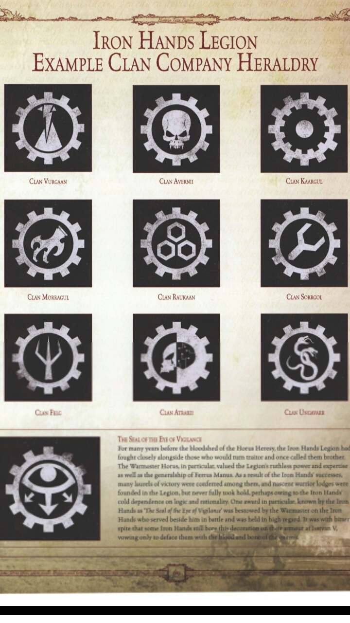 Hey all, I recently decided to start collecting a 30k Iron Hands army. I know hat I want to build one specific clan and have all of the livery and heraldy that comes with it. Unfortunately, I can't find anything online that says what certain clans specialised in, who their leaders were and where they served whether it be Istavaan or just the Great Crusade or if they had different colour schemes or pauldrons. If anyone could provide me with a breakdown or a link to something that could help in my choice, it would be really appreciated. Thanks.