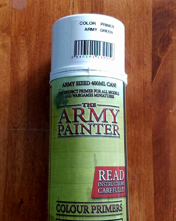 After a black matte undercoat I used the Army Green colored primer from Army Painter. These perfectly match the dropper bottles of the same range for touch-ups later in the project. The brand may not be easily acquired in your area, depending on what the shops prefer to carry. I always try to order my primer in bundles so I never run out.