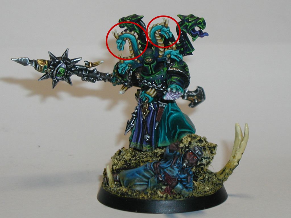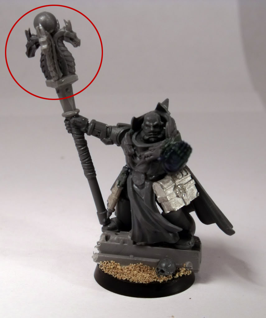 I've been hunting all over for this for a little while now and I just can't seem to come up with it. I'm looking for a specific little plastic dragon head piece, possibly the end of a banner or staff on some model, somewhere.... I don't know exactly where it's from, of course! I just know it exists. I've circled it in a couple images below (courtesy one Kaleb Daark of CMON, and one Vraks13th of BnC, respectively). If anyone can direct me to the parent kit/model, I would very greatly appreciate it!