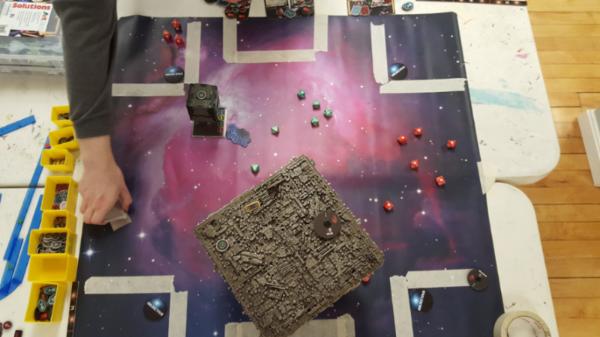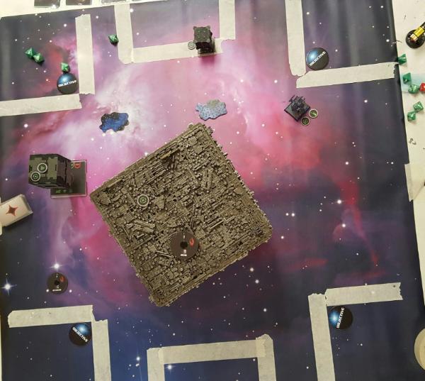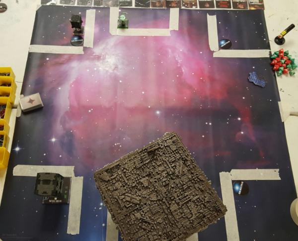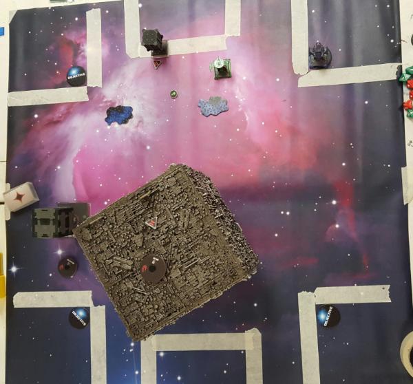 The scenario called for very specific deployment zones. Reserve ships could only enter play in the boxes in the corners. The first ship had to start in the player starting area. The tape doesn't look great but it's not the end of the world. It makes life a lot easier when you have multiple players switching out use of the board for the same scenario.