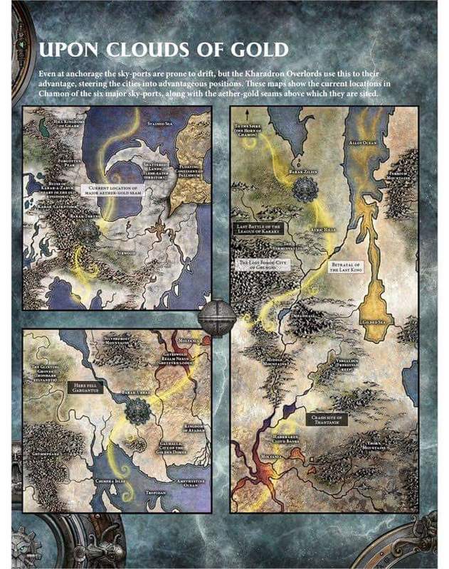 The first founded of sky-ports, Barak- Zon is also the highest situated. It is known as the City of the Sun because the light causes the floating metal Metropolis to gleam red from afar, as thought it were burning like some distant star. Fourteen triumphal arches are situated throughout the sky-port, each marking a major victory of the Kharadron Overlords. Martial pride is everything to its citizens, and rare indeed is Barak-zon Arkanaut that does not long to earn the Ironstar and be immortalised along one of the many avenues of heroes that traverse the city.