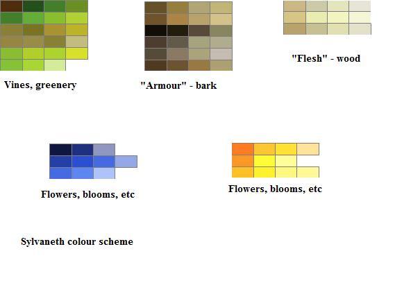 So far I've got an idea for a colour scheme, using light yellow to deep greens, off-whites/bone and muted brown-greys with any blooms and such being blue or yellow.
