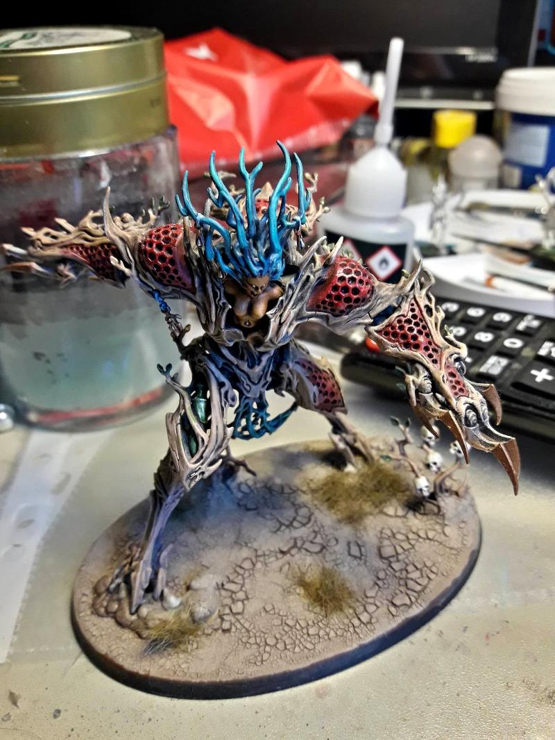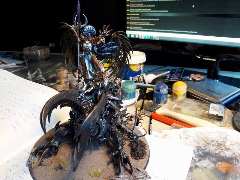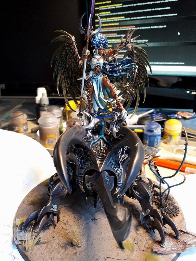 I am totally enamored with the antique bronze look on the beetle. Seriously A+ work there. At first i wasn't in love with Alarielle, but the more I look at her, the more I realize I love it. The white is incredibly well done and the blue head dress is beautiful. The only criticism I can pick out is the haft of her weapon looking a little flat. That may be down to the picture though.