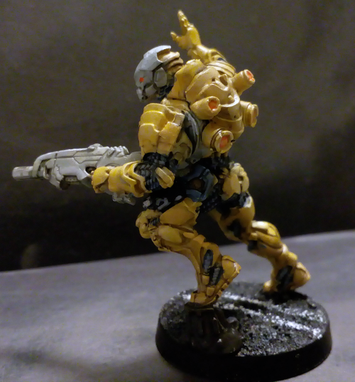 My favorite out of the box, the Tiger Soldier jump trooper with combi rifle + light flamethrower combo. So far she's failed every single Combat Jump deployment and gotten killed but she does look flashy doing it. I think she turned out somewhat acceptable, I think my painting is slowly (sloooowly) improving.