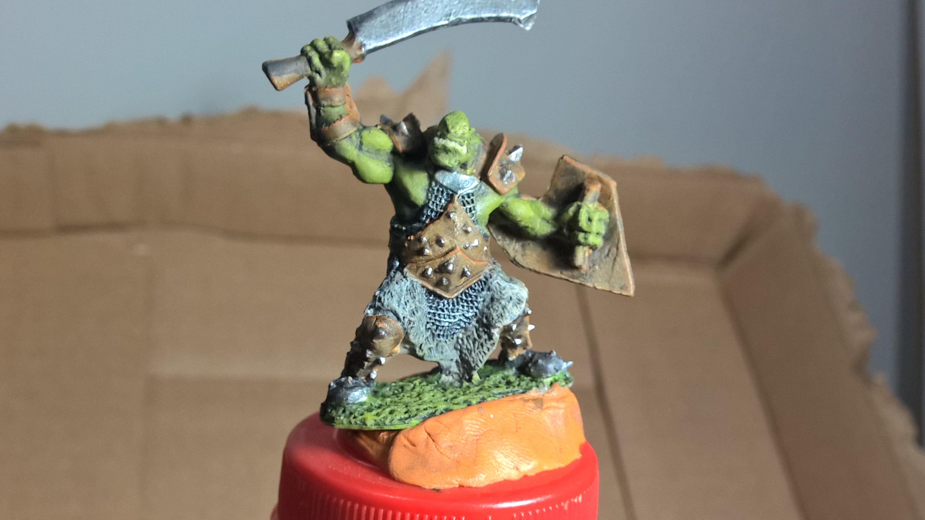 The other things to think about are what sort of thing makes a miniature look good and eye-catching. Concentrating on the face area, making that a bit brighter, or with a bit more contrast, and try to get the face looking as neat as possible. It's a pain, because it's always quite a difficult area to paint, but it's always the thing people look at first. The other part of your orc that the eye would be drawn to is the sword, so a really bright highlight across the top of the blade would look cool.