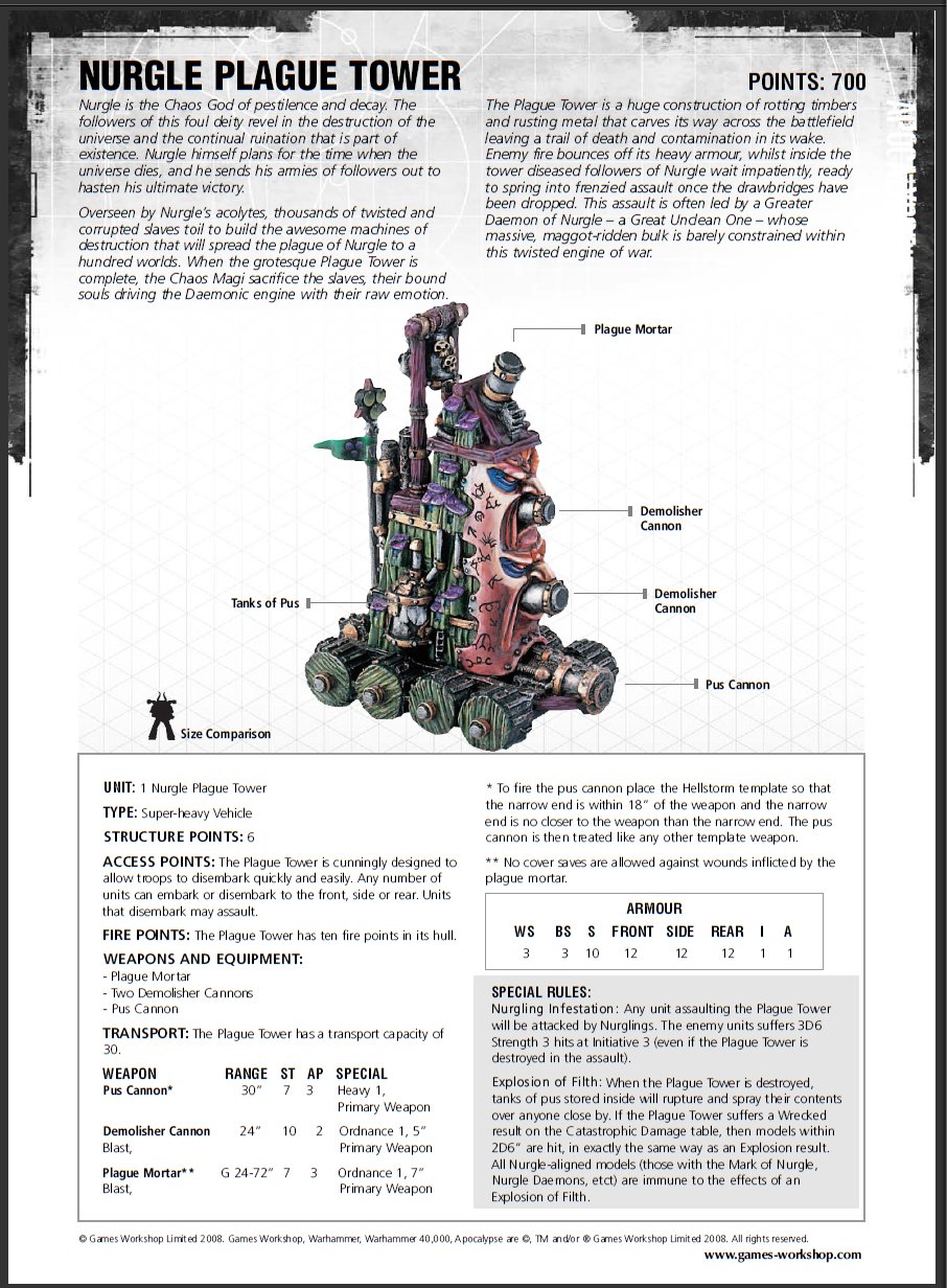 Found a few fan made rules but they're terrible. Wrong points cost, I'm not going to believe you can field a supper heavy mobile fortress for under 600pts and 2000's way too high. Some idiot thinks it's got lascanons on it instead of demolishers, and another hasn't got any rules for the puss cannon and plague mortar. They clearly have no idea what a plague tower is let alone how it's supposed to play. It's a waste land of clueless out there and I am lost.