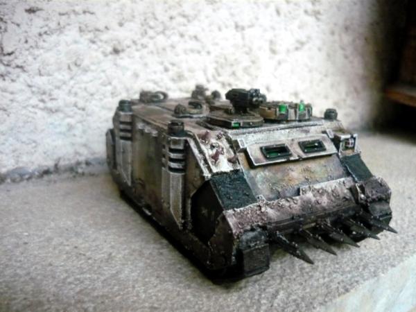 2) Legs lots of legs! Chitinous legs e.g. from Chaos Spawn or Tyranid parts, the more the merrier. Its no longer a Rhino its a Centipede! (Perhaps even lots of zombie legs, powered by many nurgle Fred Flintstones...)