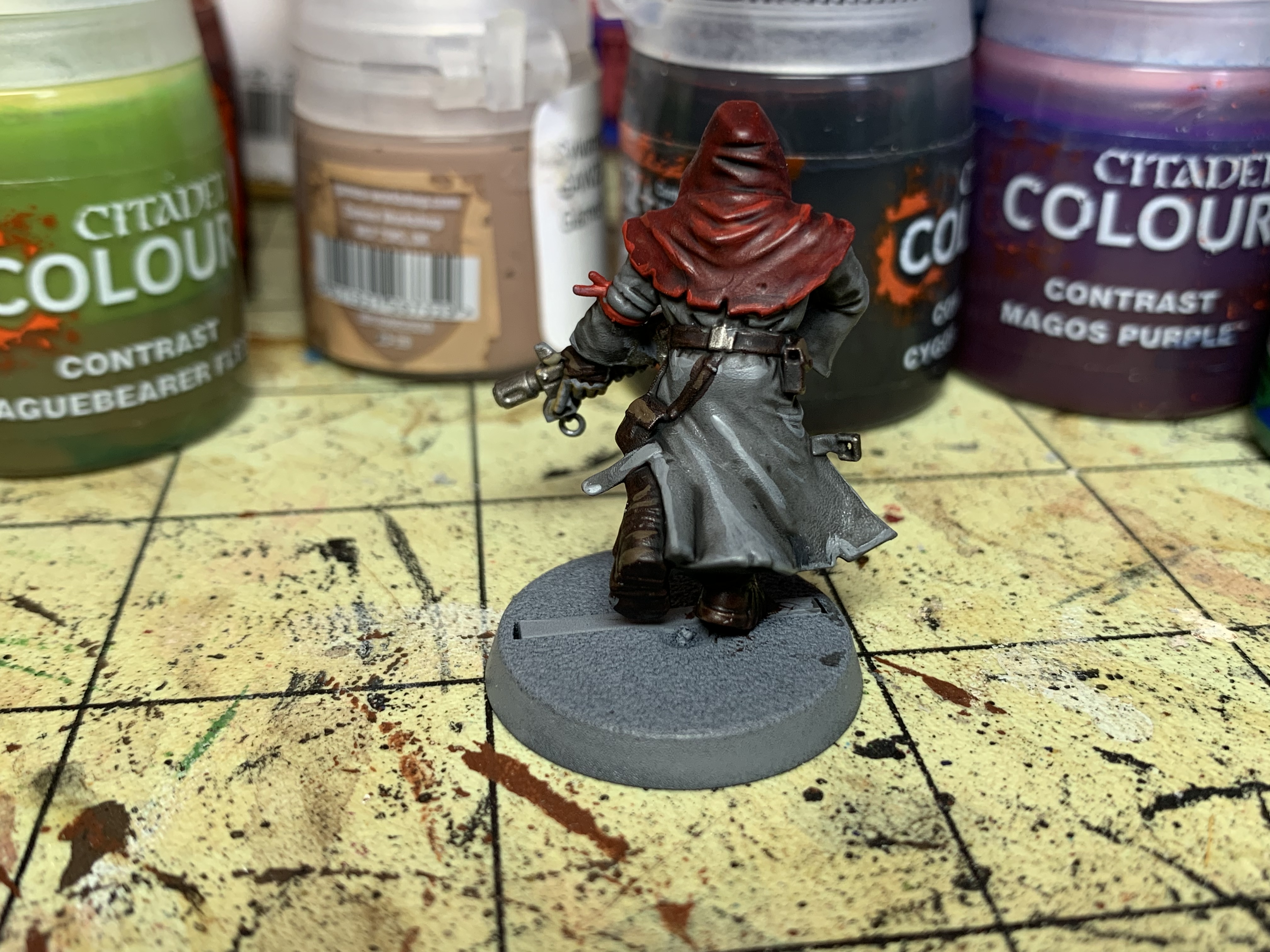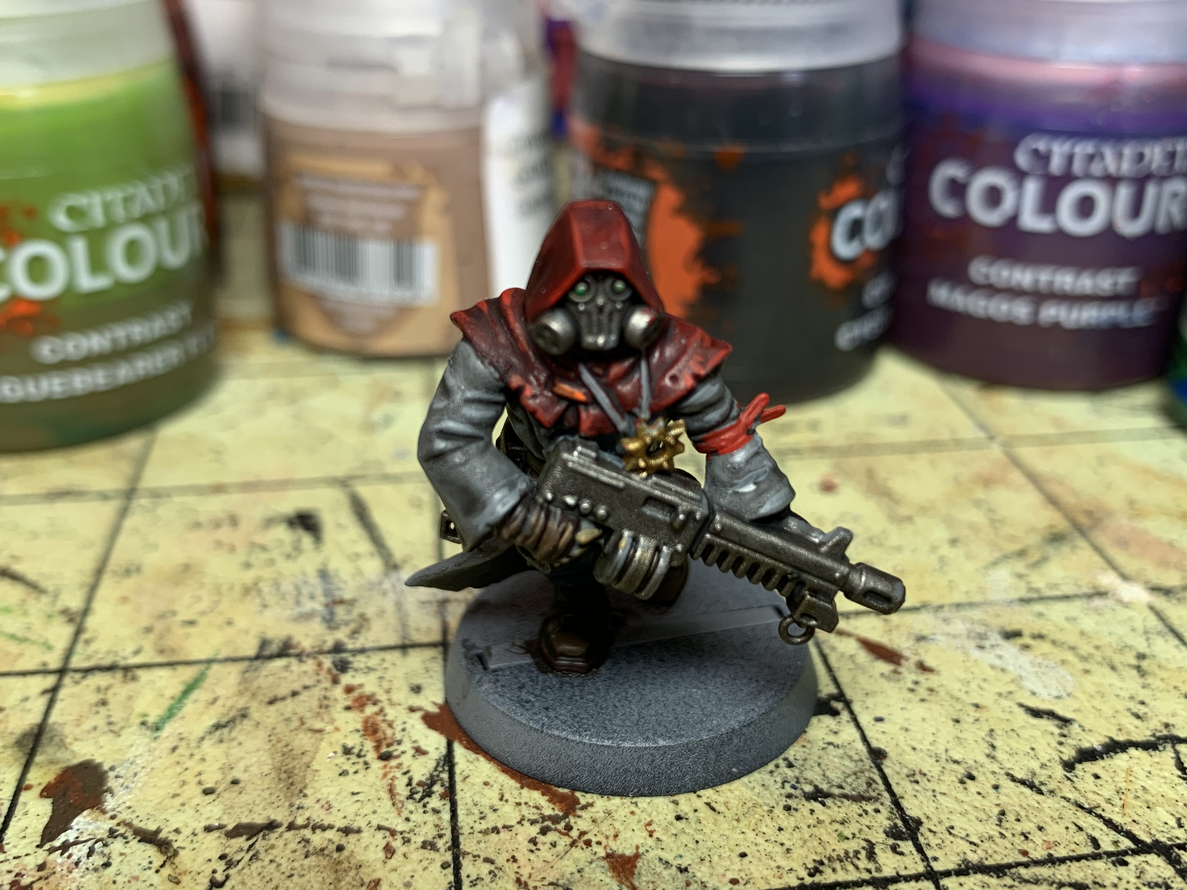 Next up is a unit of cultists, trying to again do a quick and simple scheme. Using a mix of contrast paints and classic I was able to get 20 models done with 3 colors. I then painted the metal on 4 of them with a nuln oil wash. After that dried I did some touch up work ( limited to half an hour), on one model. Here is a shot of him before basing. Any CC welcome.
