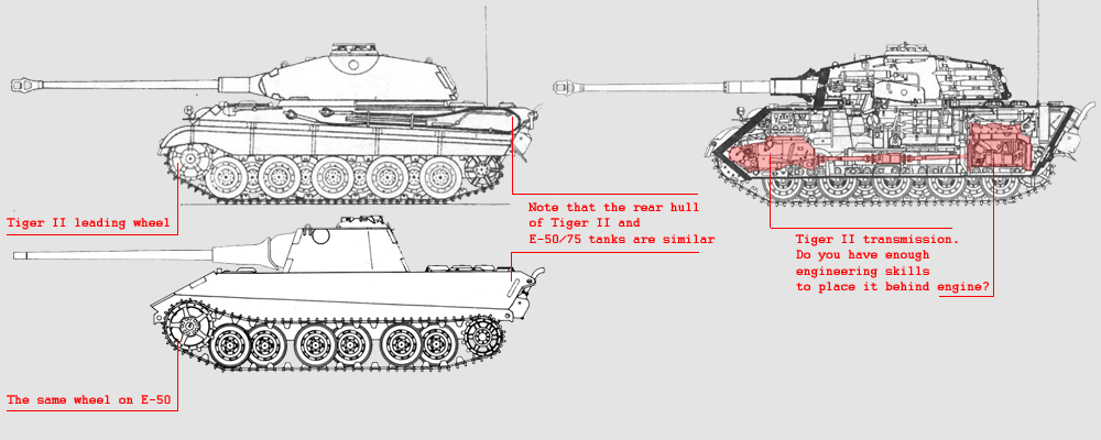 A comparison of the Tiger II and E-50/75 (the E-50 used a Panther II/ had a different roadwheel arrangement, but was largely the same as the E-75 > I've posted an E-50 already here, or at least the WoT fictional version).