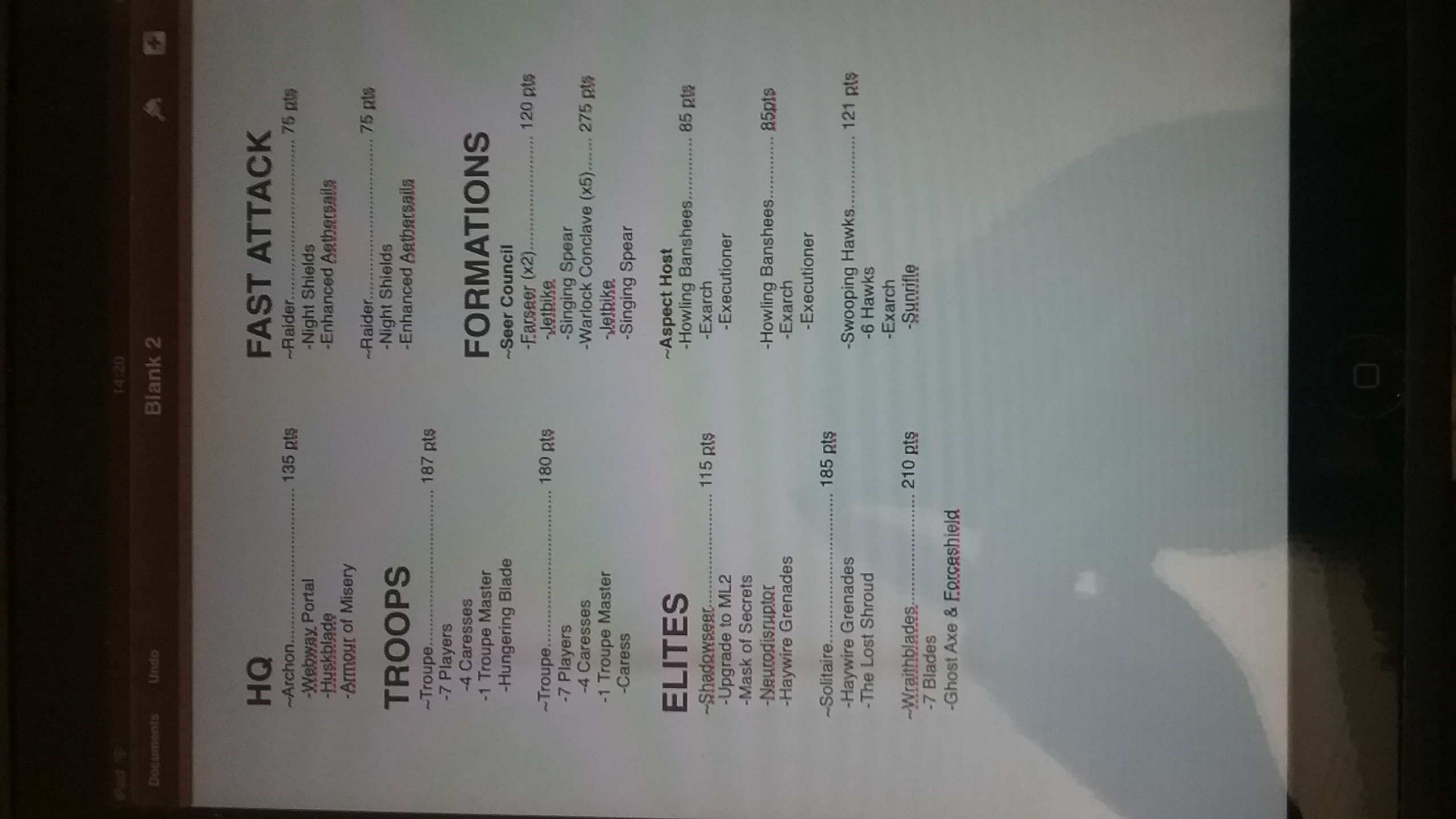 As for the Wraithblades, I completely agree. They could annoyingly be stuck in reserves all game on bad rolls, though if I get the psychic power Scriers Gaze to reroll reserves it would help a little. I'm now thinking of getting rid of the 2 extra wraithblades and try and see what upgrades I don't absolutely need and squeezing in an Autarch for the +/- 1.