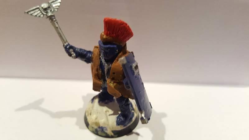 I've based a lot of their asthetic upon the original concept sketches, rather than the 2nd Ed models (although I did use these as inspiration for the magistrate, replacing the eagles with a ridge of hair in the classical style), simply to keep a bit of distiction in them, and so I can if I choose use a handful of the 2nd Ed models (or the necromunda Arbites) as stand-out squad leaders etc.