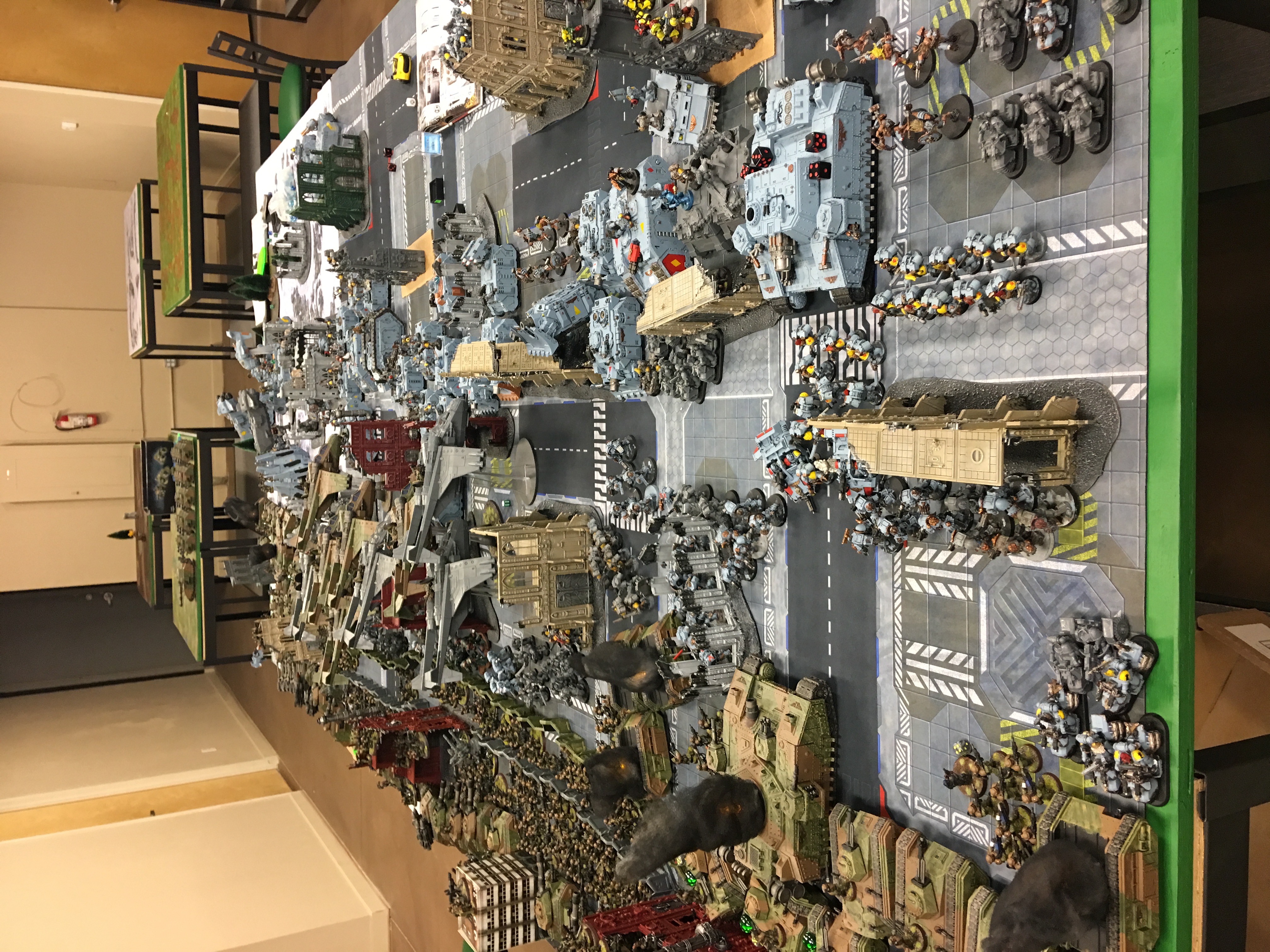 Below is a 26,000 pt per side (52,000) game between myself (he spacewolf player) and my main opponent (the guard player).