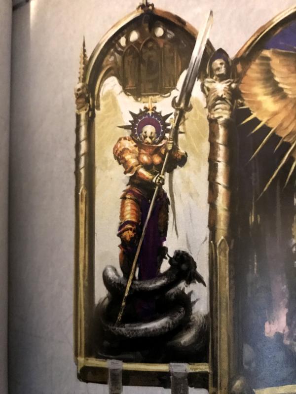 I'm looking for help picking parts for a conversion I'd like to have a crack at. Basically I love the bit of art on p37 of the new 8th edition book - the right of the "ecclesiarchy" page. I like the whole piece but was specifically wanting to build a model for the female knight and serpent on the left of the image. I'd like to have a crack at building the central pulpit as terrain and the priest on the right but that's a conversation for another time. I was wondering what parts people thought I should use.