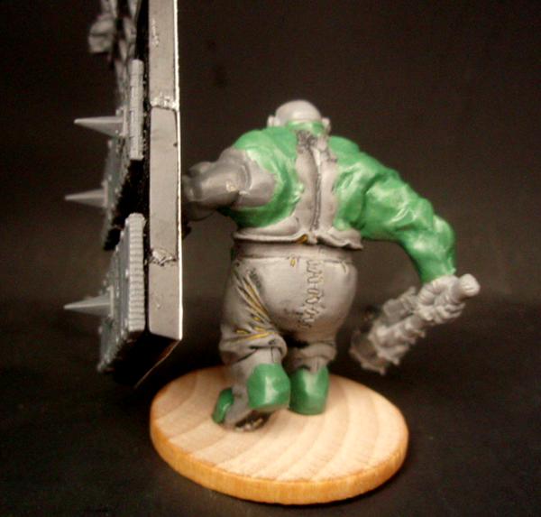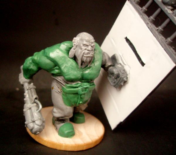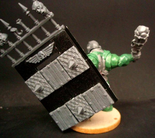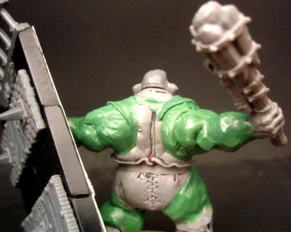Still need to find some bits for the edges and back of those shields. Number three is about 75% done. I sculpted him some chest armor, so at least one of these three guys has some sense (if that ever applies to bullgryns)