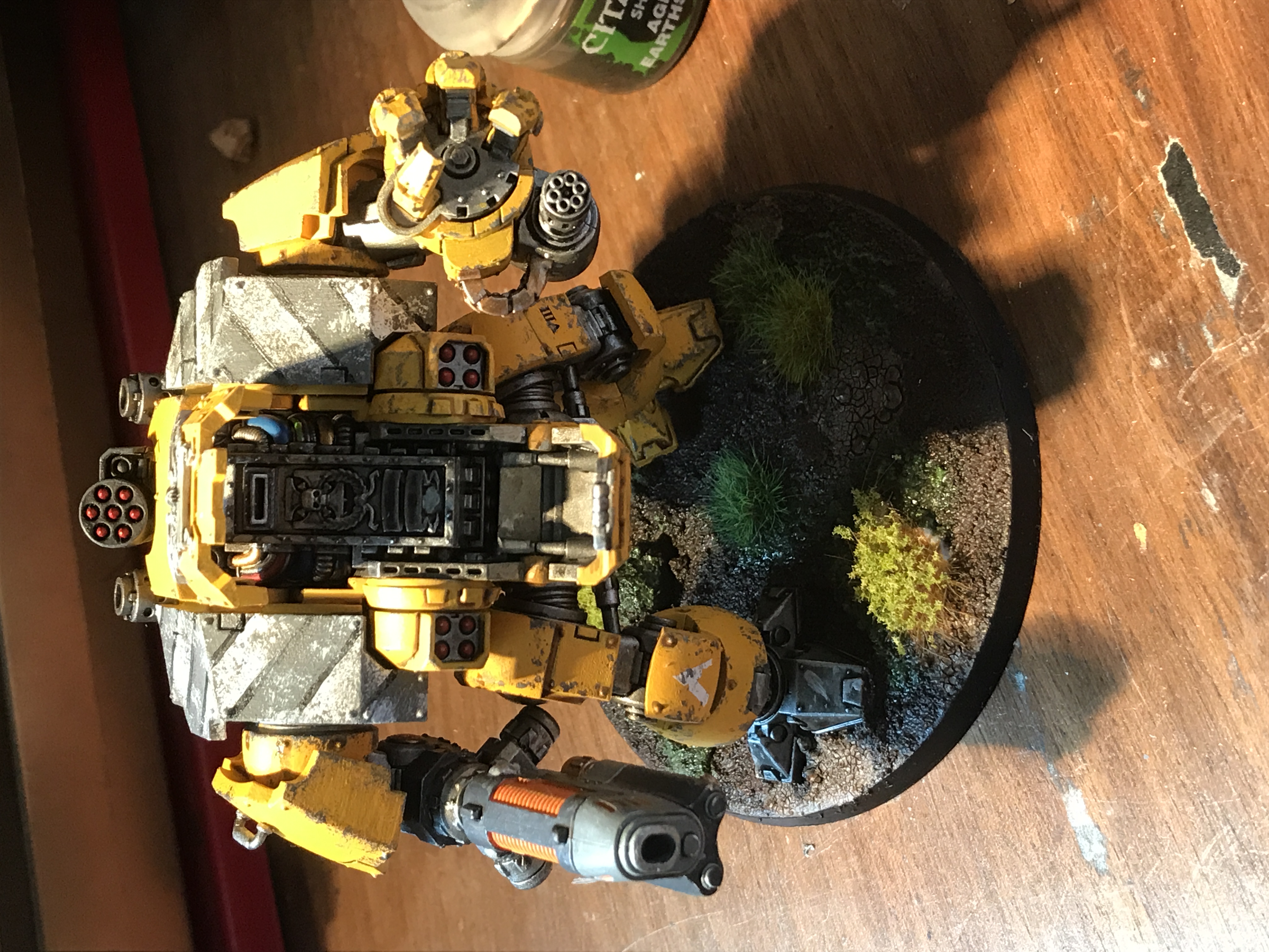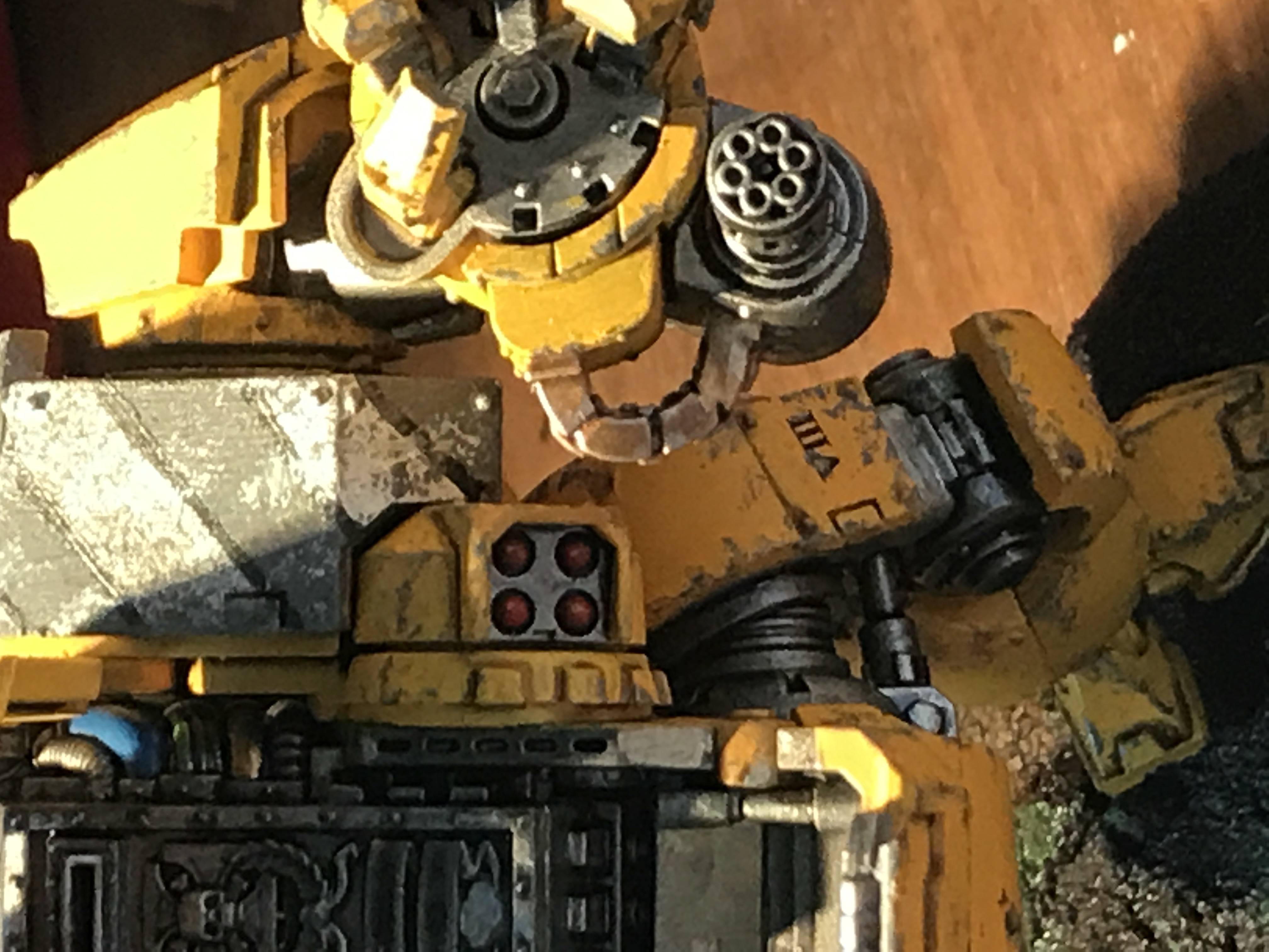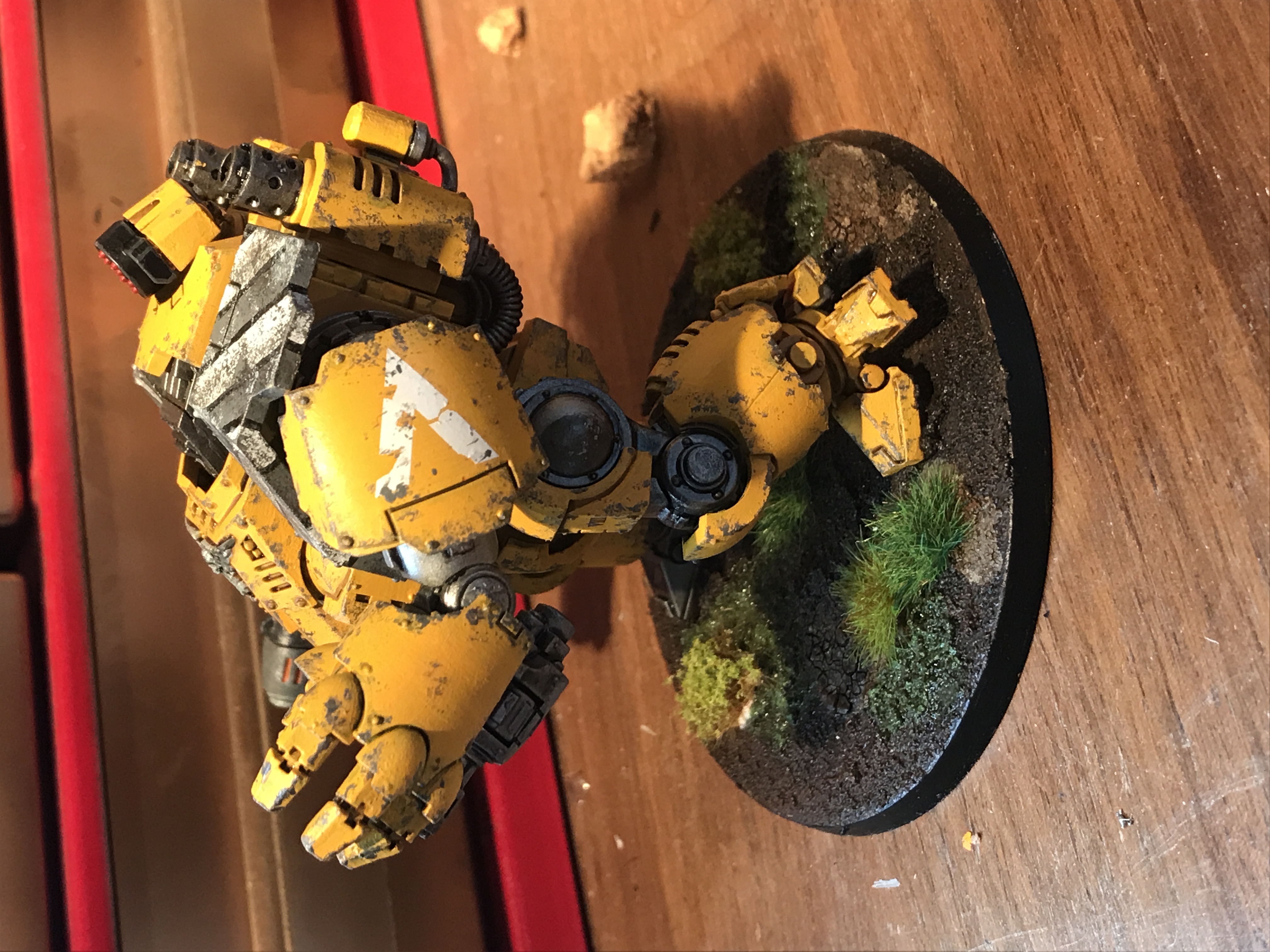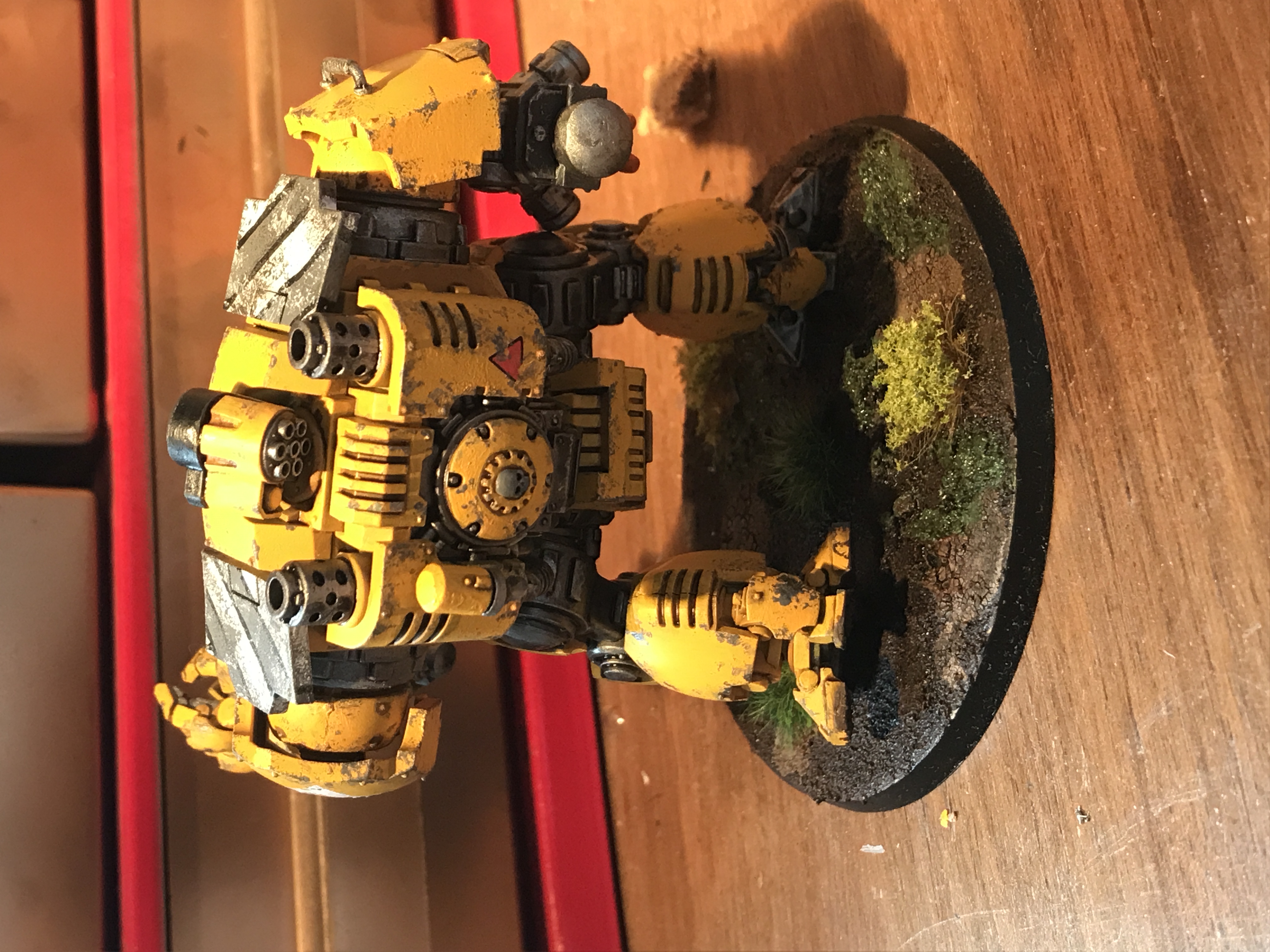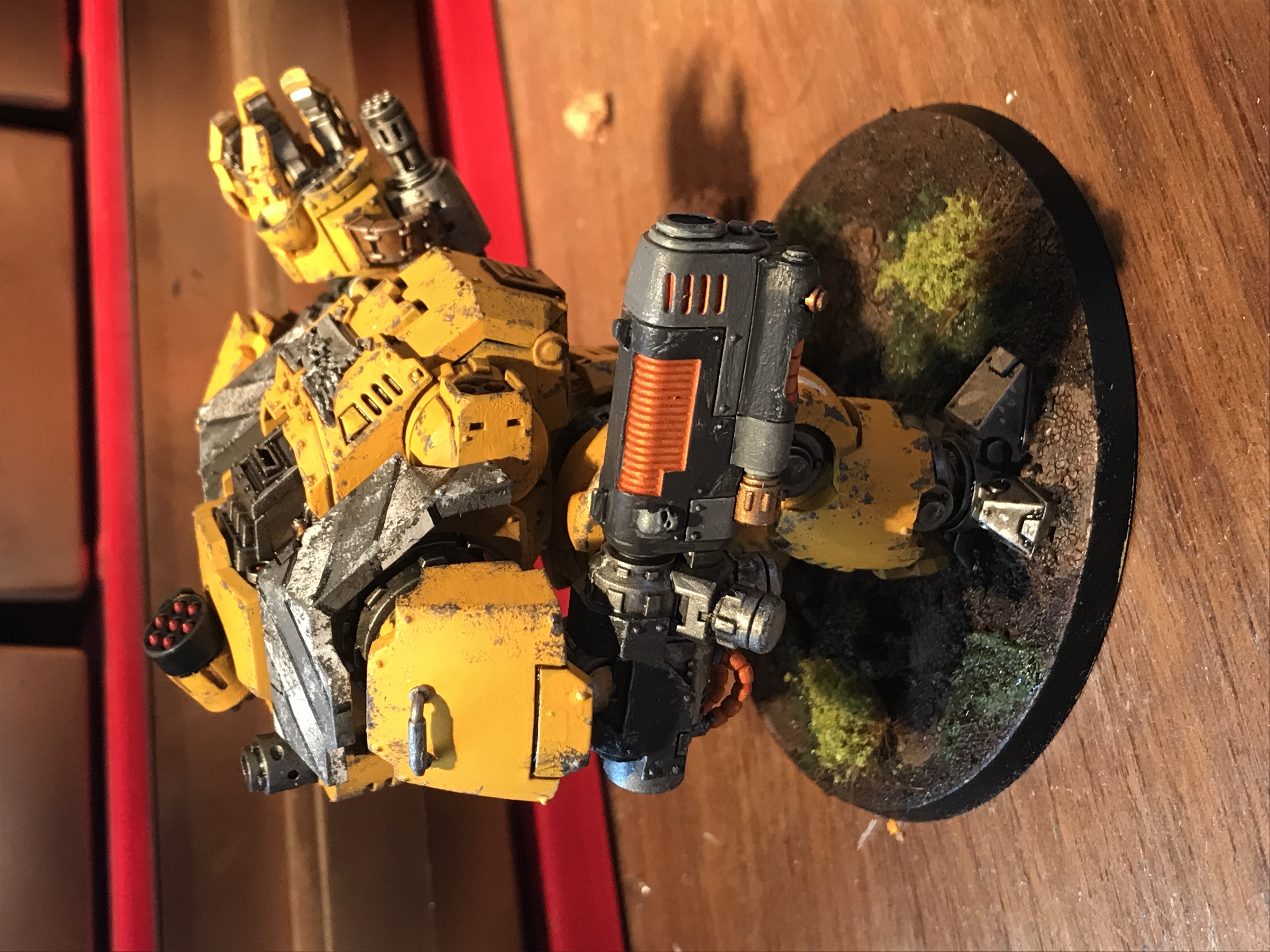 Here's my Dreadnought, thought I'd have a bit of fun with this one so I designed and painted it as if it was previously some futuristic construction equipment and then had been modified and weaponised hence the yellow paint job, hazard stripes and weathering. Hope you like . I also have a Primaris Repulsor to do but trying to think of a cool/unique way I could do that so glad of any suggestions