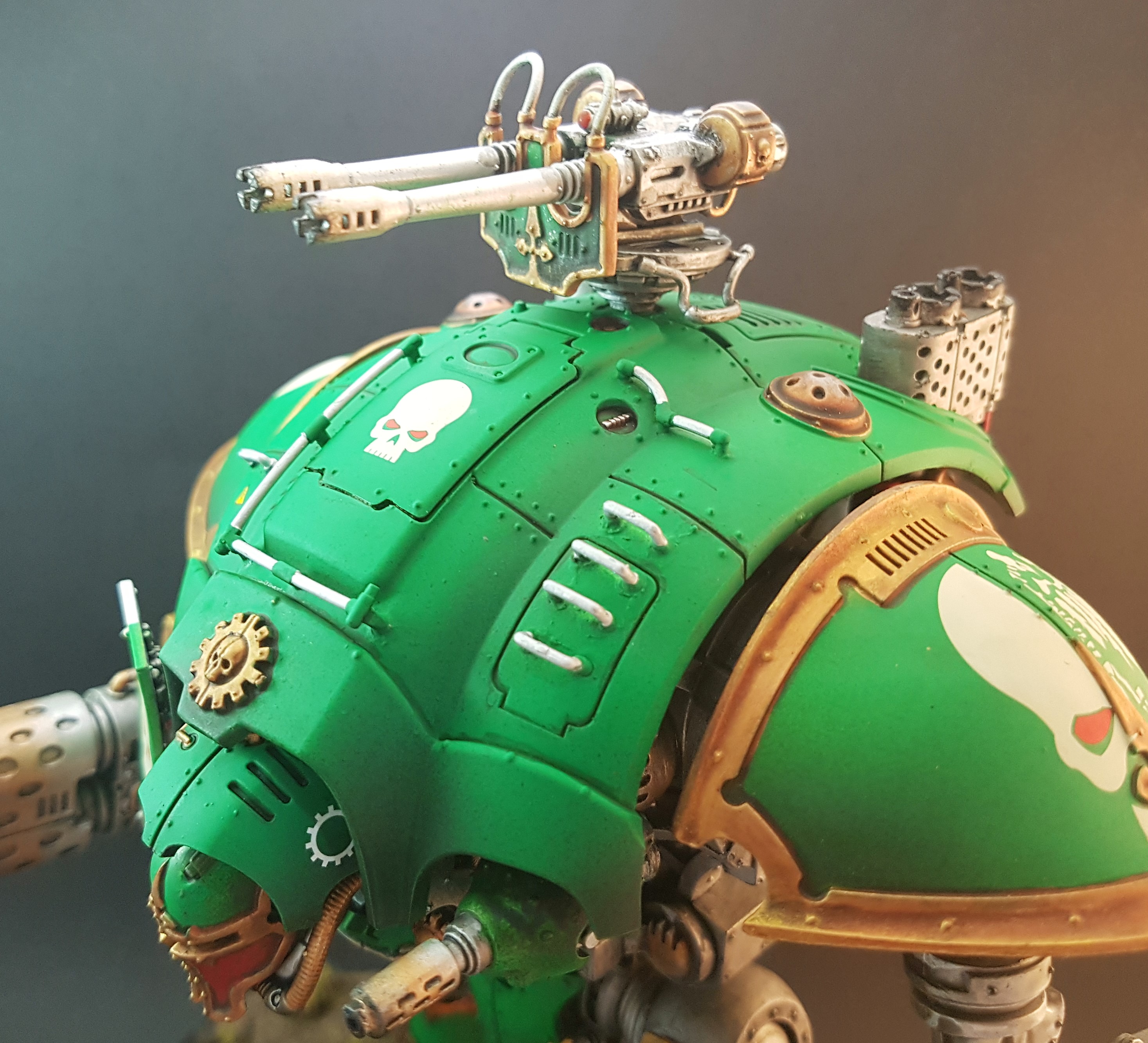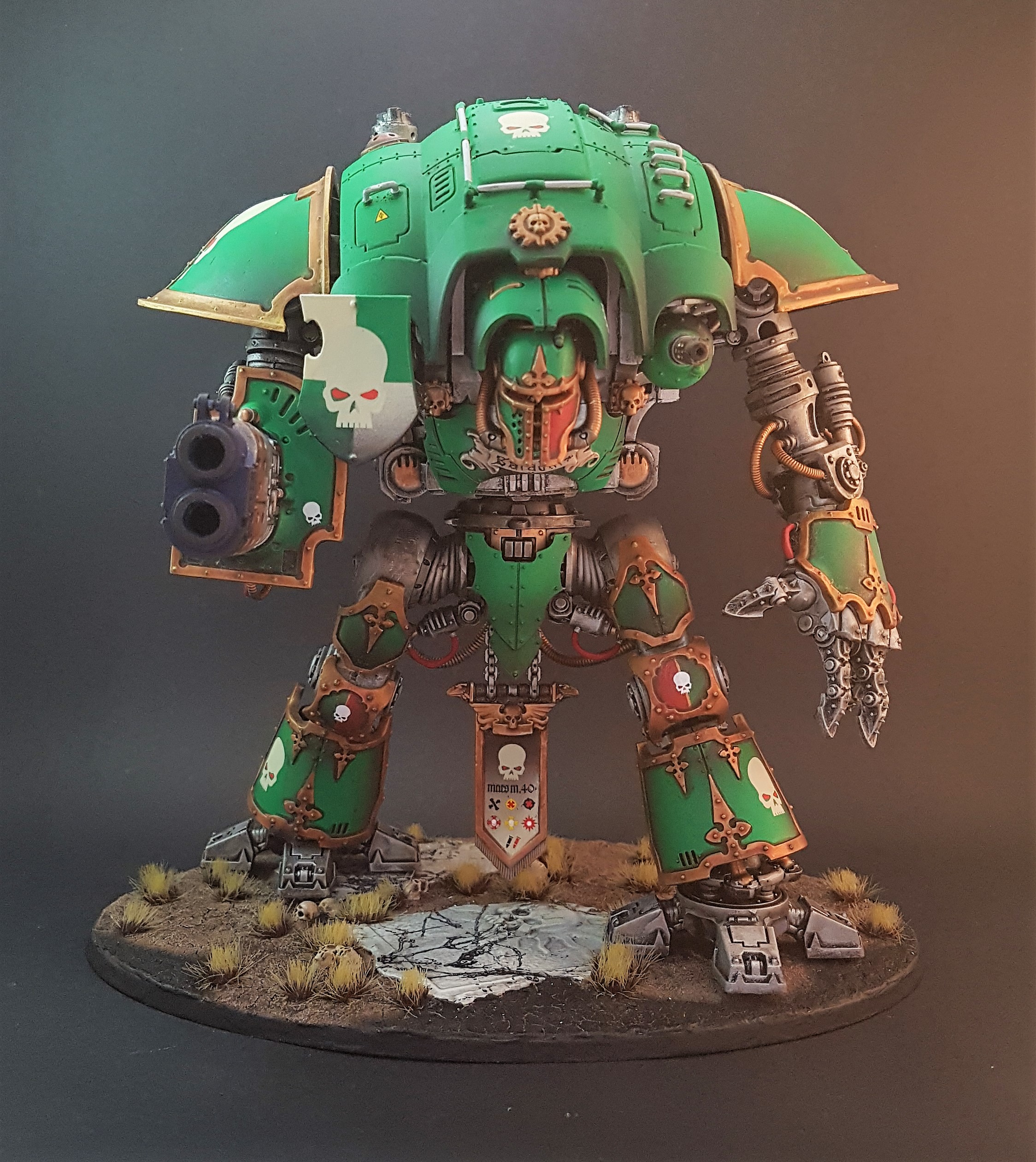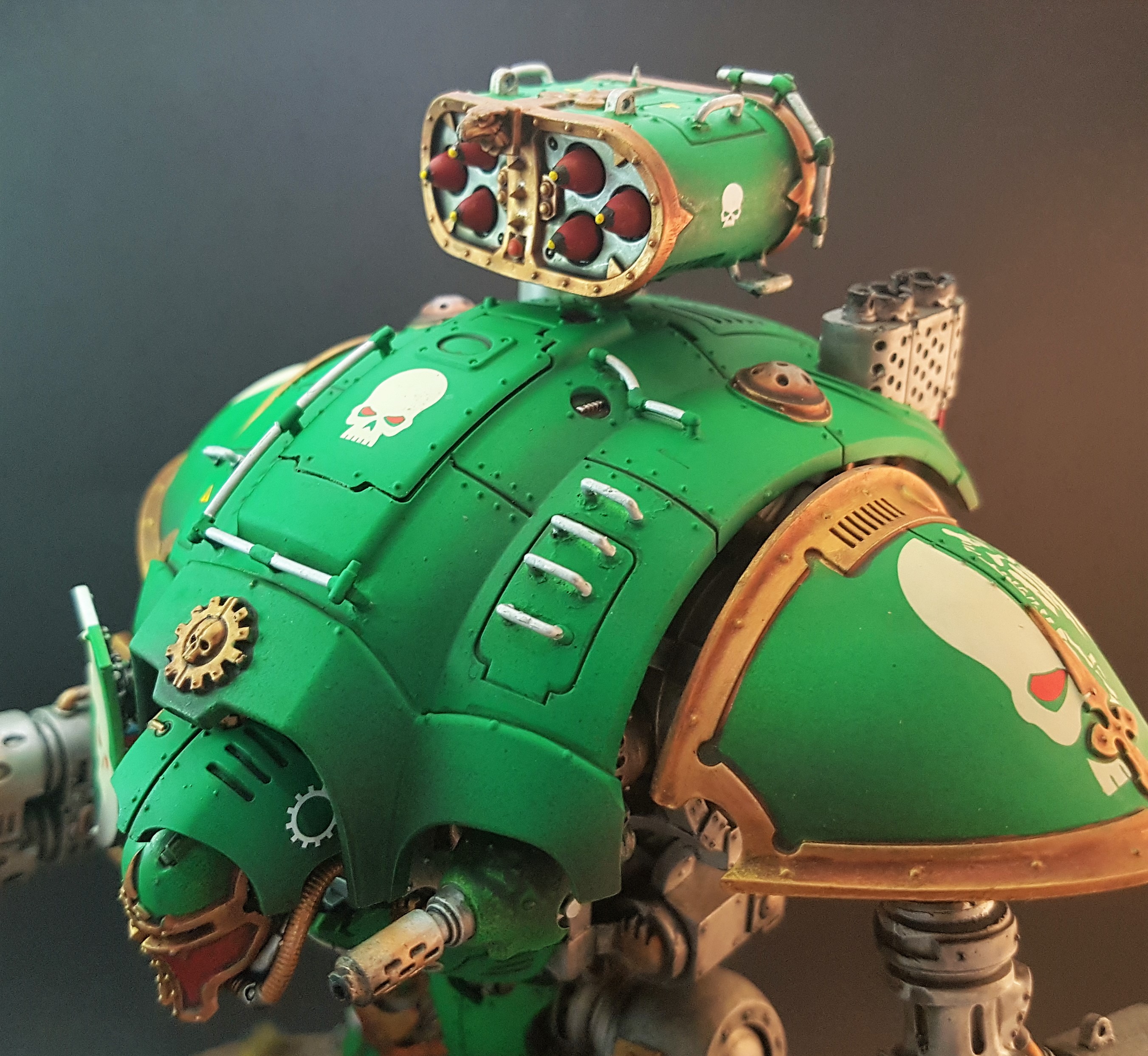 Nicely done. The only thing I'd comment on is the paintwork and feet are too neat, given the weapons have obviously been used. No one seeing this beast on the other side of the field would let it get away scratch free, and if it had just been re-painted they would likely have cleaned the barrels of the weapons.