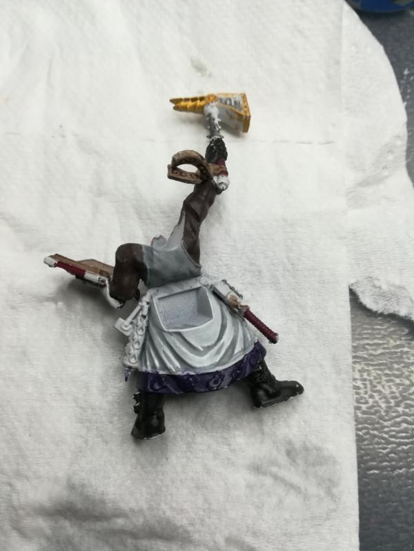 Think I have what you're after. The white headgear hear is just a white base coat, thinnly washed with (old GW) asurmen blue, then layered and highlighted up with mixes of asurmen blue and white up to pure white.