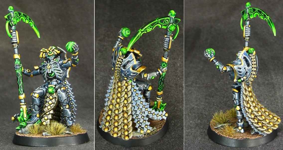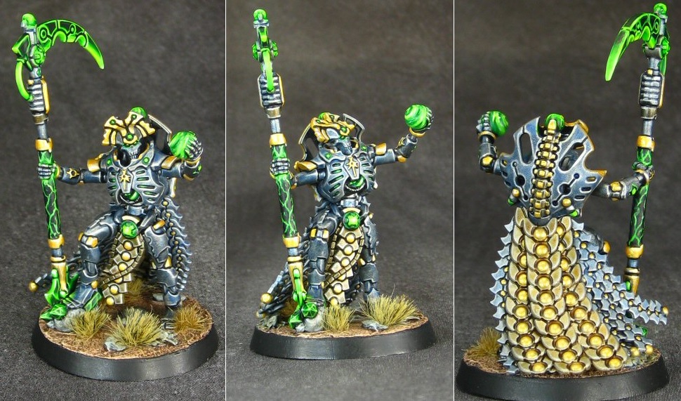 Here are photos of my latest work. A Necron Overlord. Metallic Blue with gold trim and neon green glowing energy. I made some minor modifications. I changed the position of his arm and head so he is looking into the swirling green globe instead of just holding it up in the air. I painted the orb to look like the Portals on "Rick&Morty". I liked the look of the green swirling vortex. I painted the handle of his staff to look like the energy is running through it and it is gathering where he is holding it. Kind of like those electric glowing balls you might find at a novelty store..