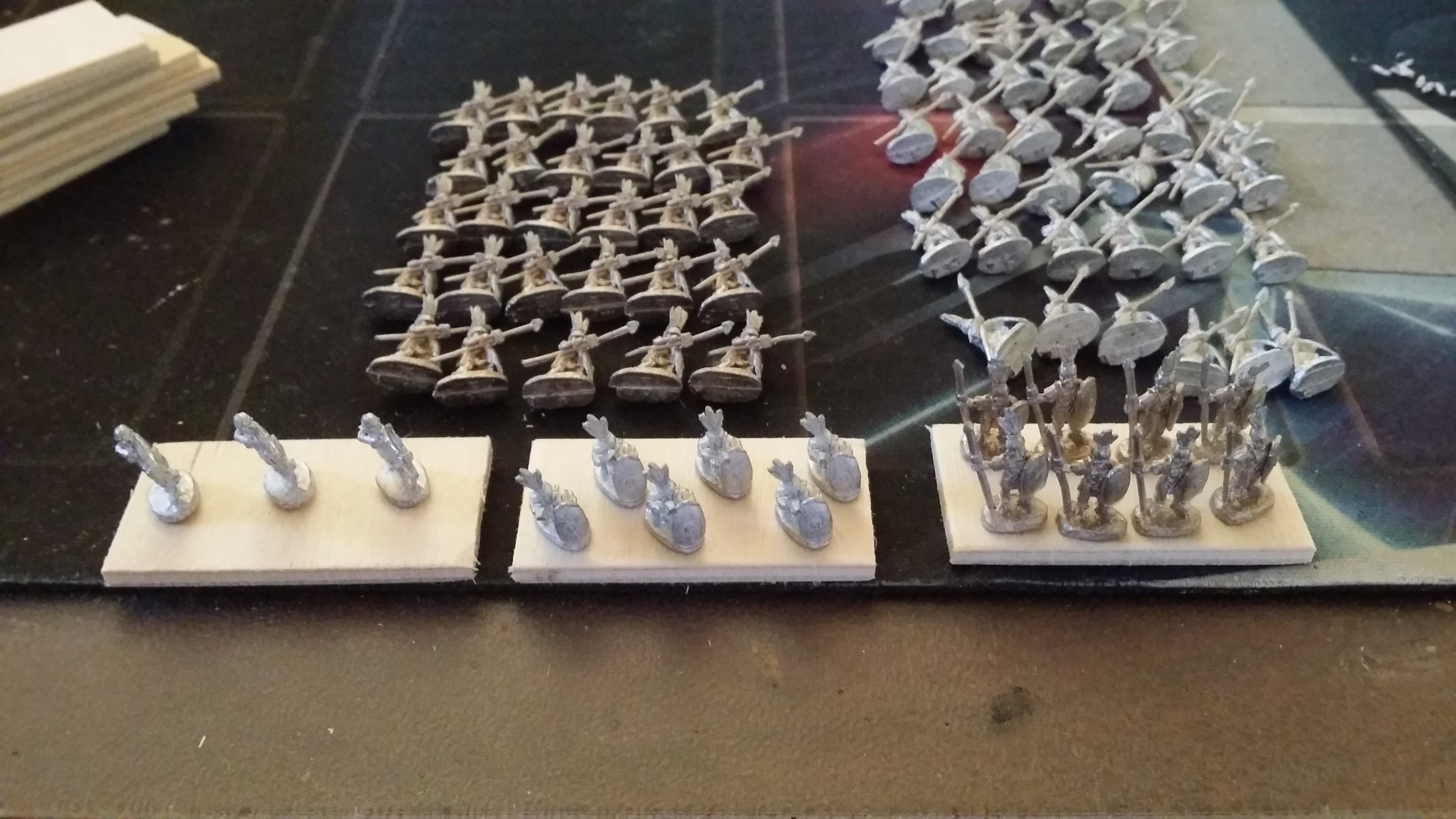 This allows people to use their DBA/WRG/FoG bases with ADLG, by making stands of units out of 1-3 bases for other systems. Or, as my group has done, you just use the larger bases sizes as single stands, like so: