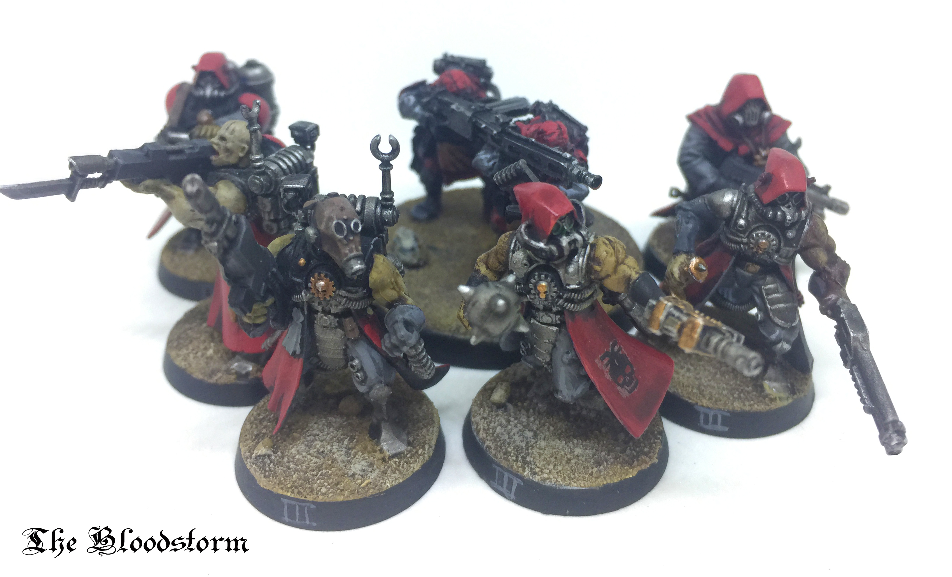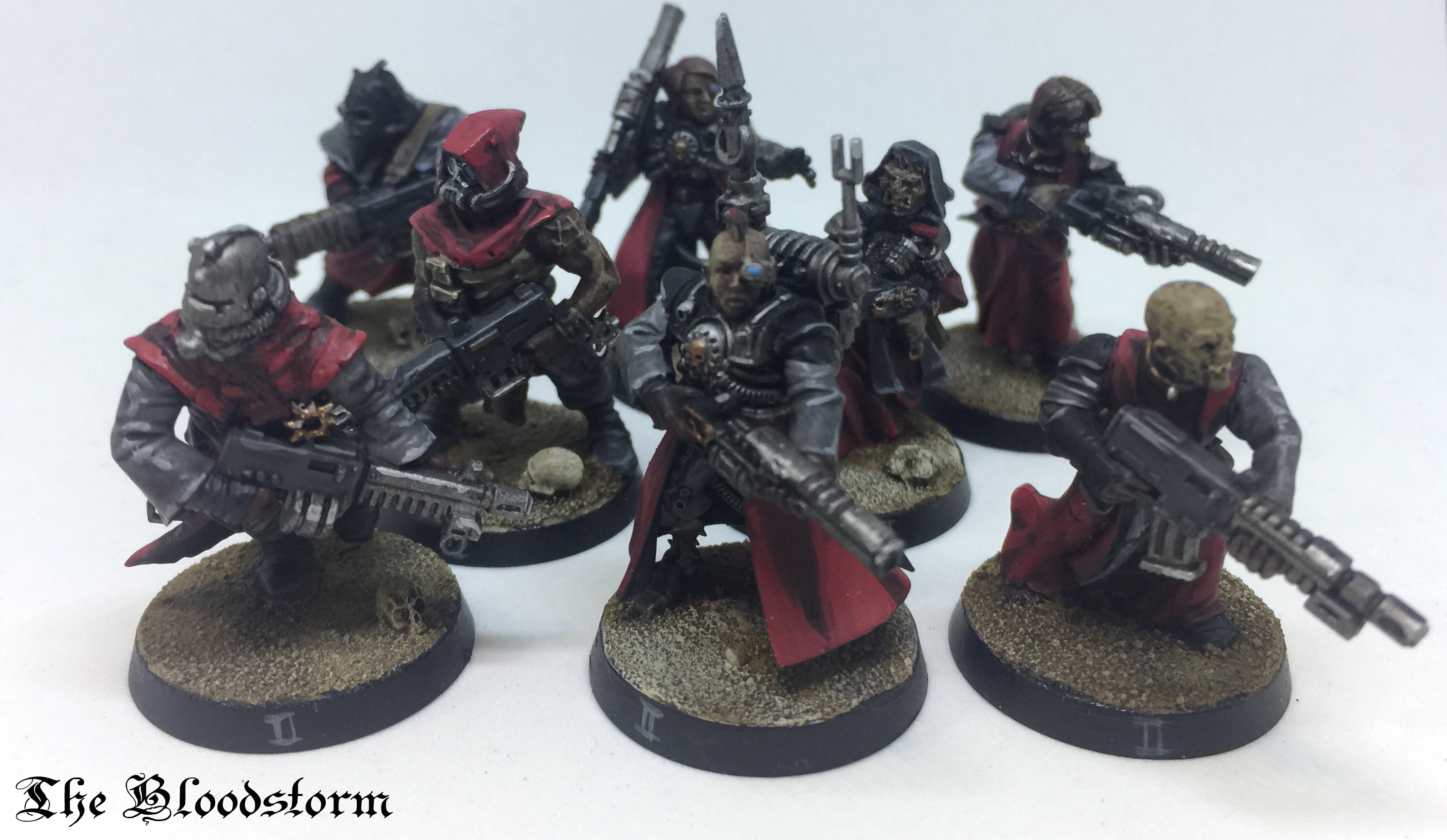 Next are the three squads of the first platoon (the first is the platoon command squad). Some of these models have been shown before, but the squads have been reorganised slightly, so there are some new models here. The models are mostly kitbashes of cultists, Skitarii vanguard, Cadian troops, Catachan troops and Empire flagelants. There are also heads from Bad Squiddo games and a ganger from Necromunda. See if you can spot where the parts came from!