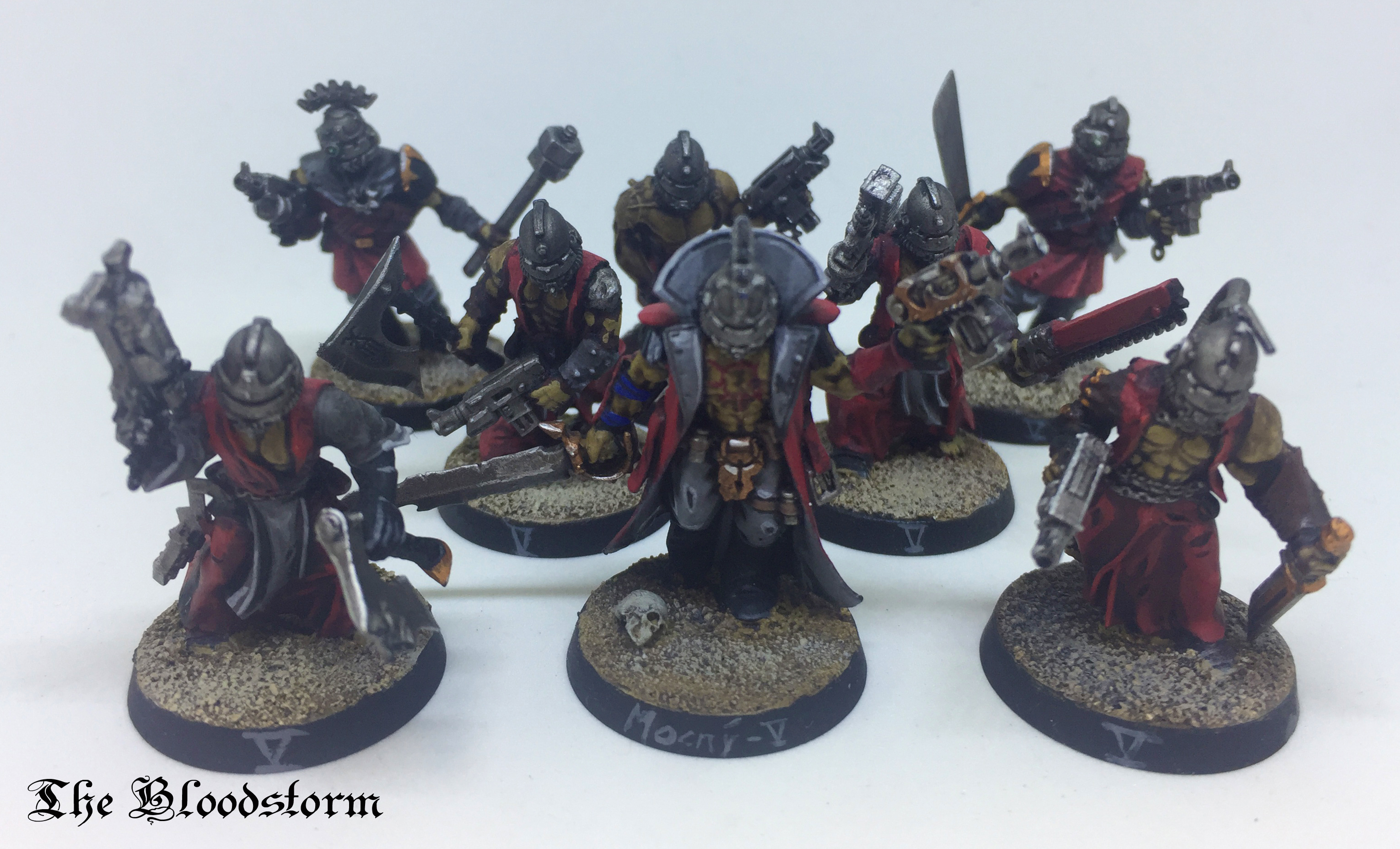 This is the command squad. Stroj is the biggest character with a power axe and bolt pistol. There are some Forge World Renegade Militia Command models in here, and a two plastic cultists.