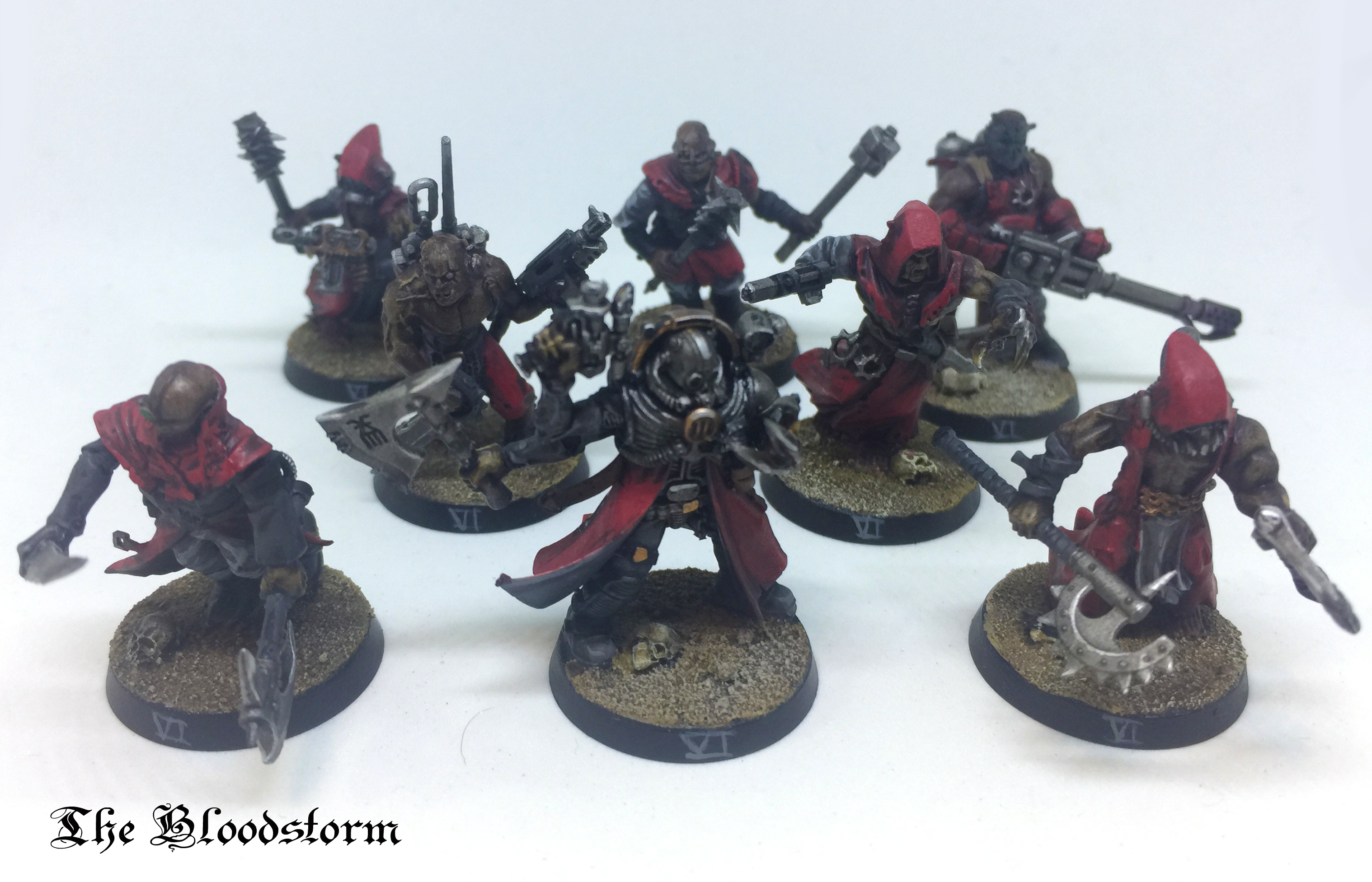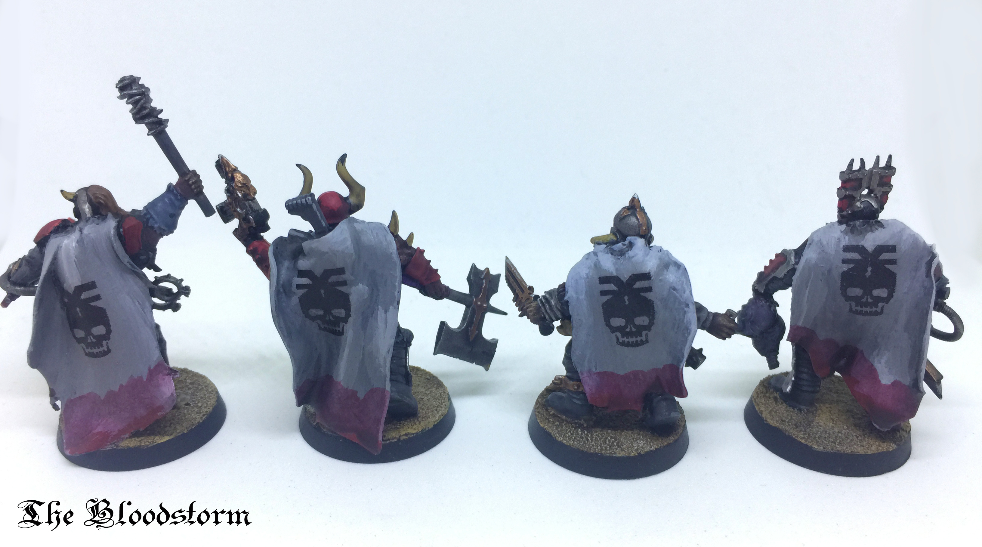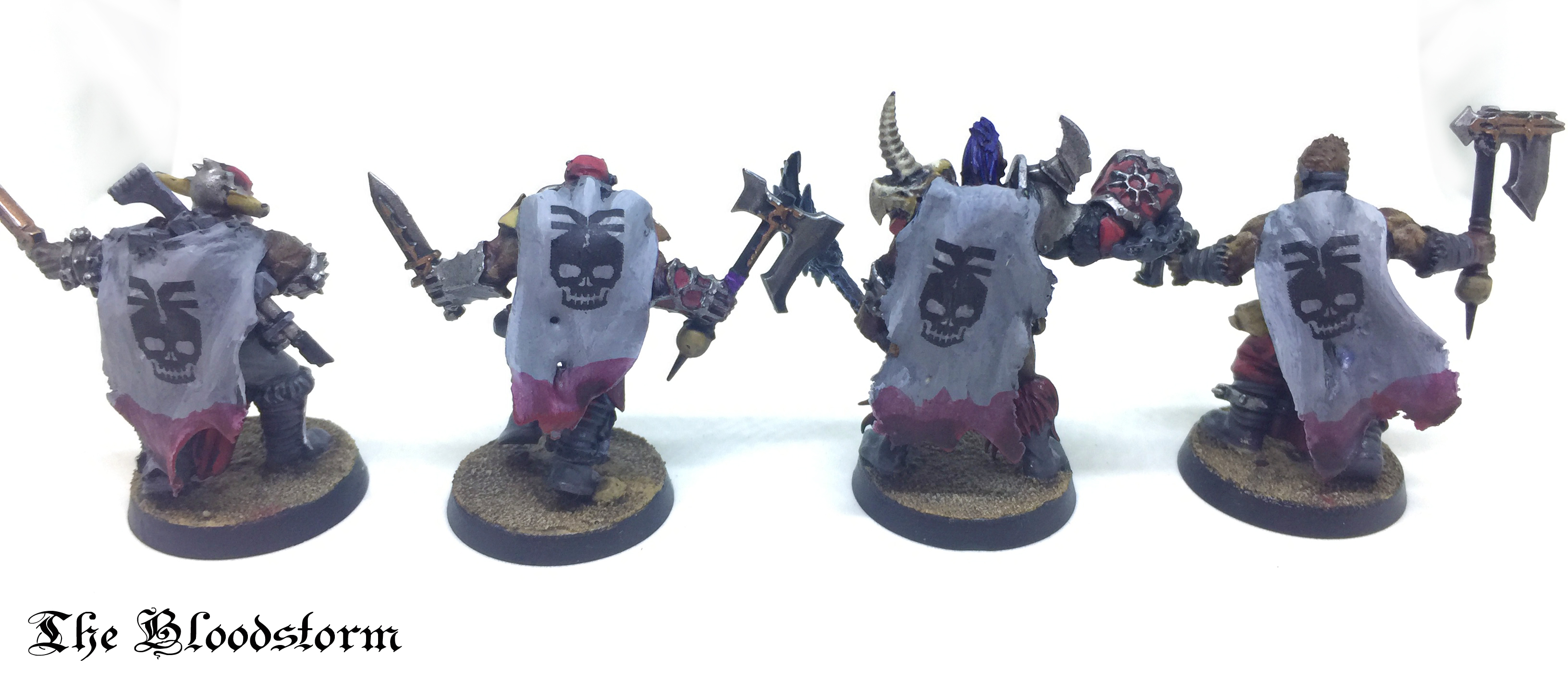 Next up are the veterans. These guys are bigger, badder and more bloodthirsty than their comrades, and are made of various larger models - mostly blood reavers, but all are heavily converted. These guys carry a lot of equipment for their raids behind enemy lines. I'm particularly proud of some of the poses and the lasguns poking out from their cloaks. Oh yeah, the cloaks - blood-soaked cloaks that sport the icon of The Bloodstorm.