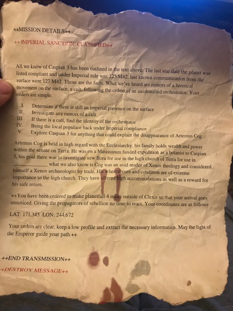 I have been ordered to reign in the gothic sector, this cluster of planets is essential to guarding the safety of the greater imperium. I’ve heard faint whisperings of an uprising on the planet Caspian 3 which reek of heresy as well as a complete shutdown of the space port Aquilus for an unknown reason. Due to the nature and scope of the orders I have been given, I found it necessary to gather three inquisitors and their retinues to aid me. These inquisitors will come from different schools of thought and parts of the galaxy to work together, that is if their differences don’t drive them to kill each other first. This will be a true test of humanity’s will to save itself against perilous odds. Will they succeed or will the gothic sector be the next in line to fall to chaos…. The outcome rests on my shoulders.