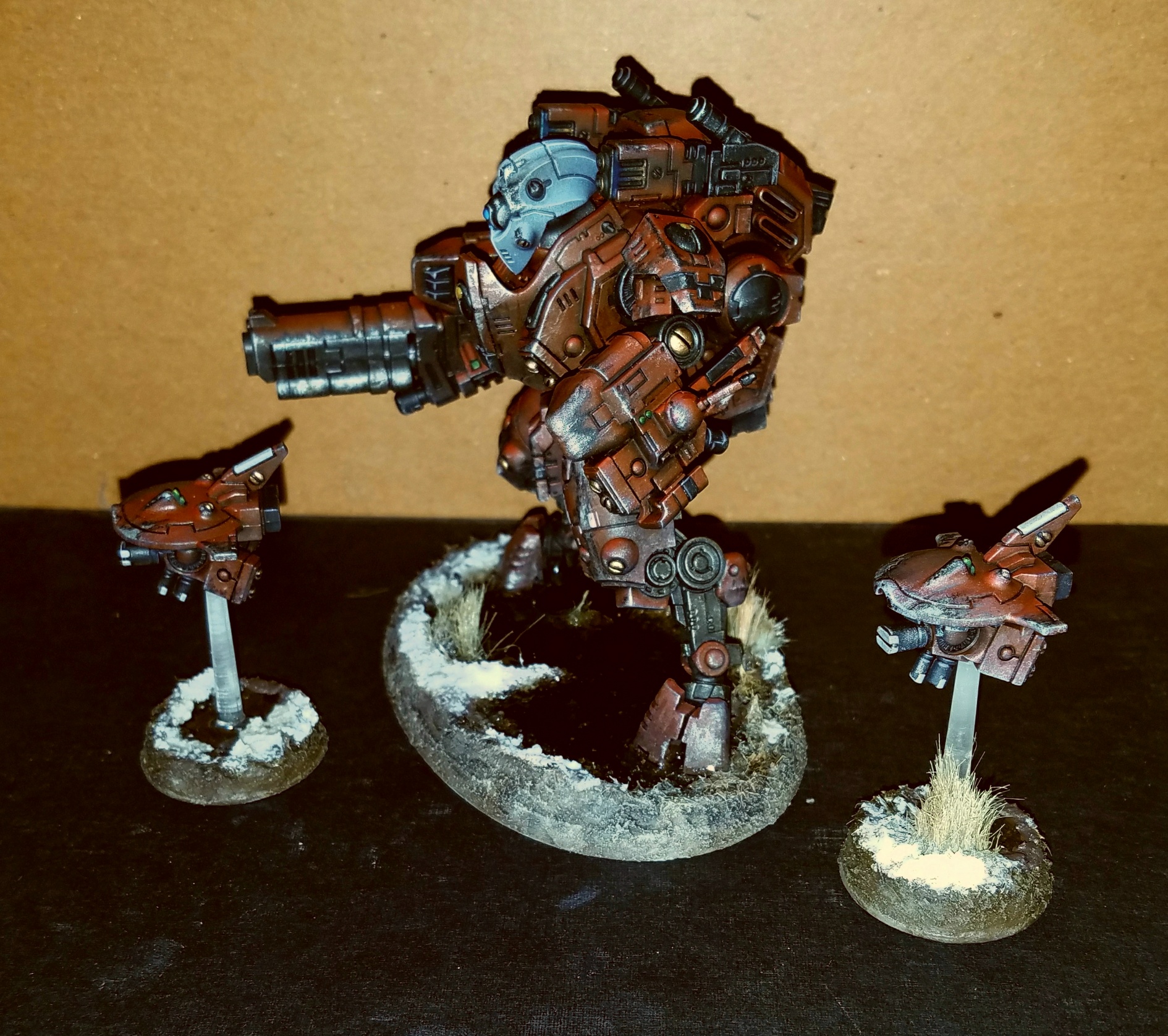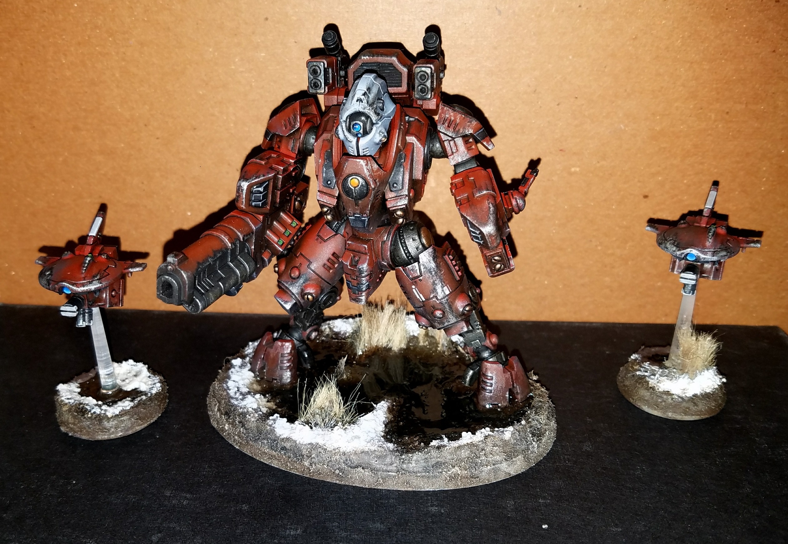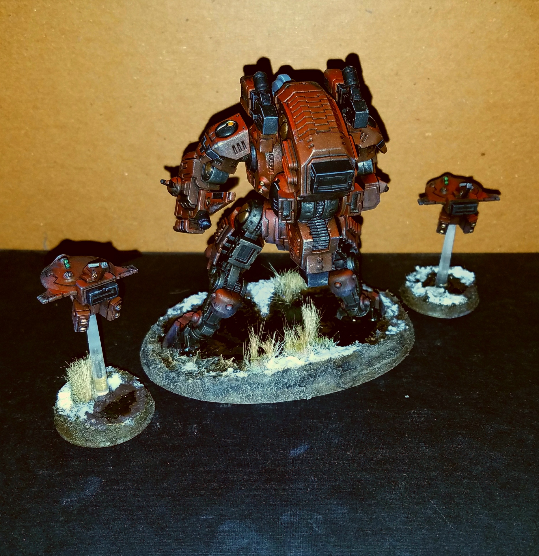 Here's a Ghostkeel I recently finished. I became a big fan of weathering / battle damage, so I thought I would continue with my Tau army. I hope to have a 1000 points done for Adepticon 2018. I had the chance to pit her against a Primaris army, and she definitely held her own; took out a Redemptor dreadnought in one turn