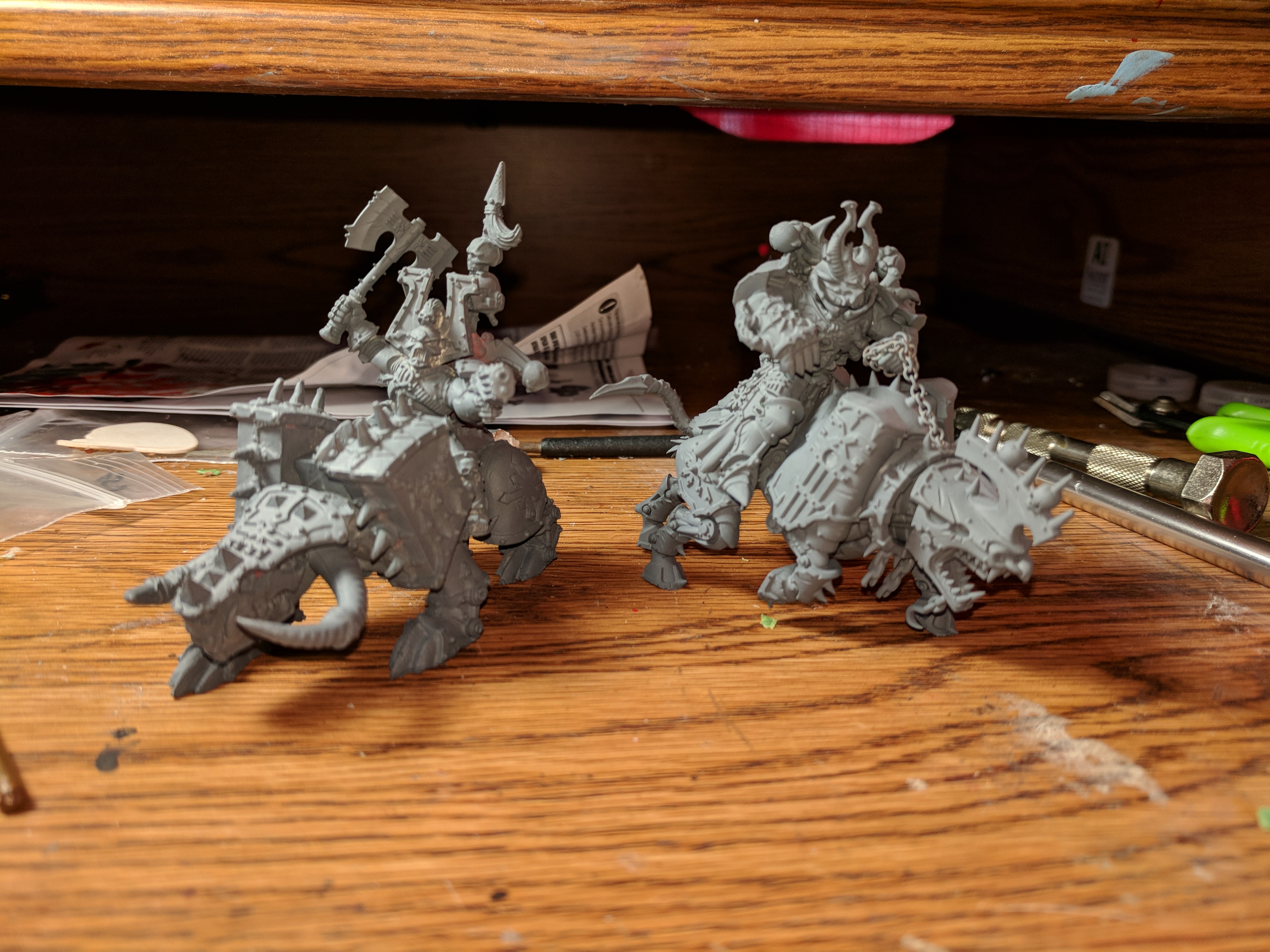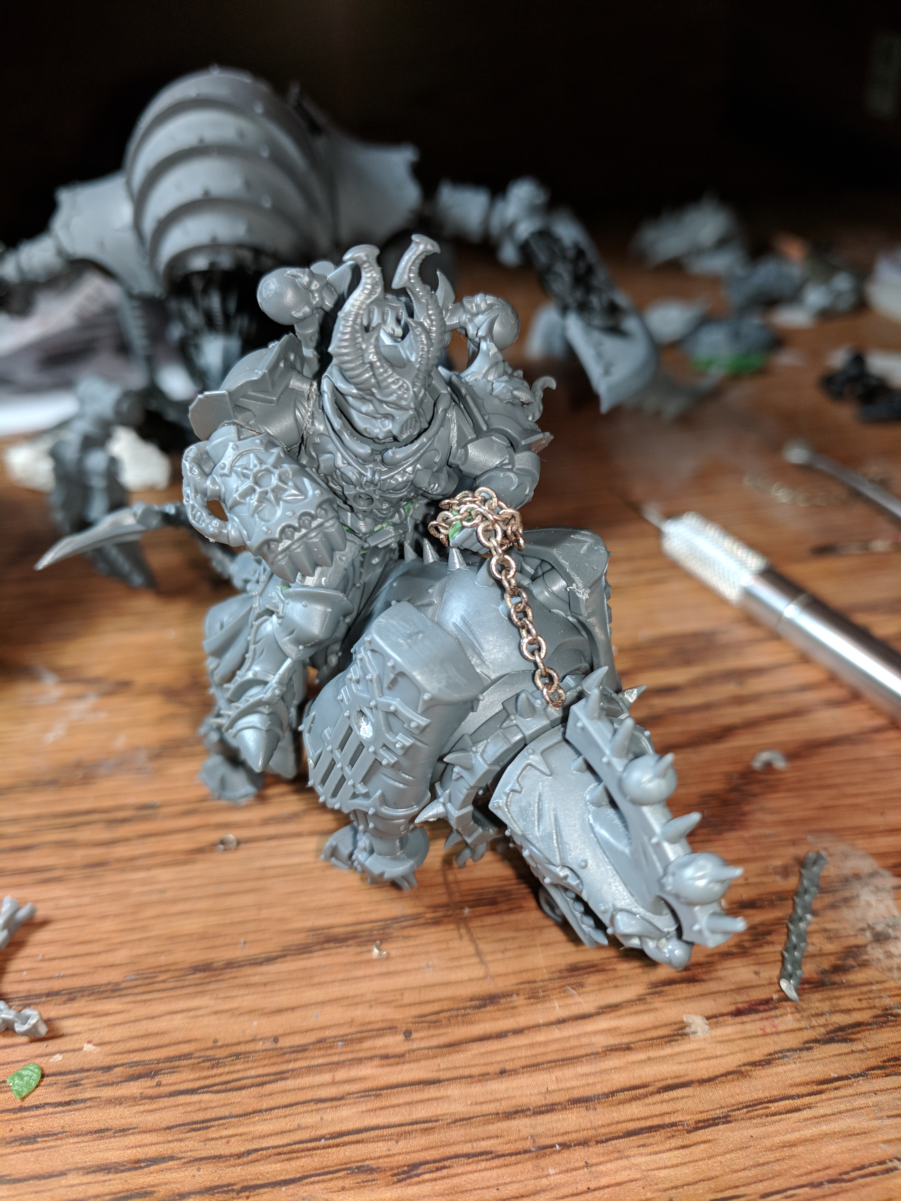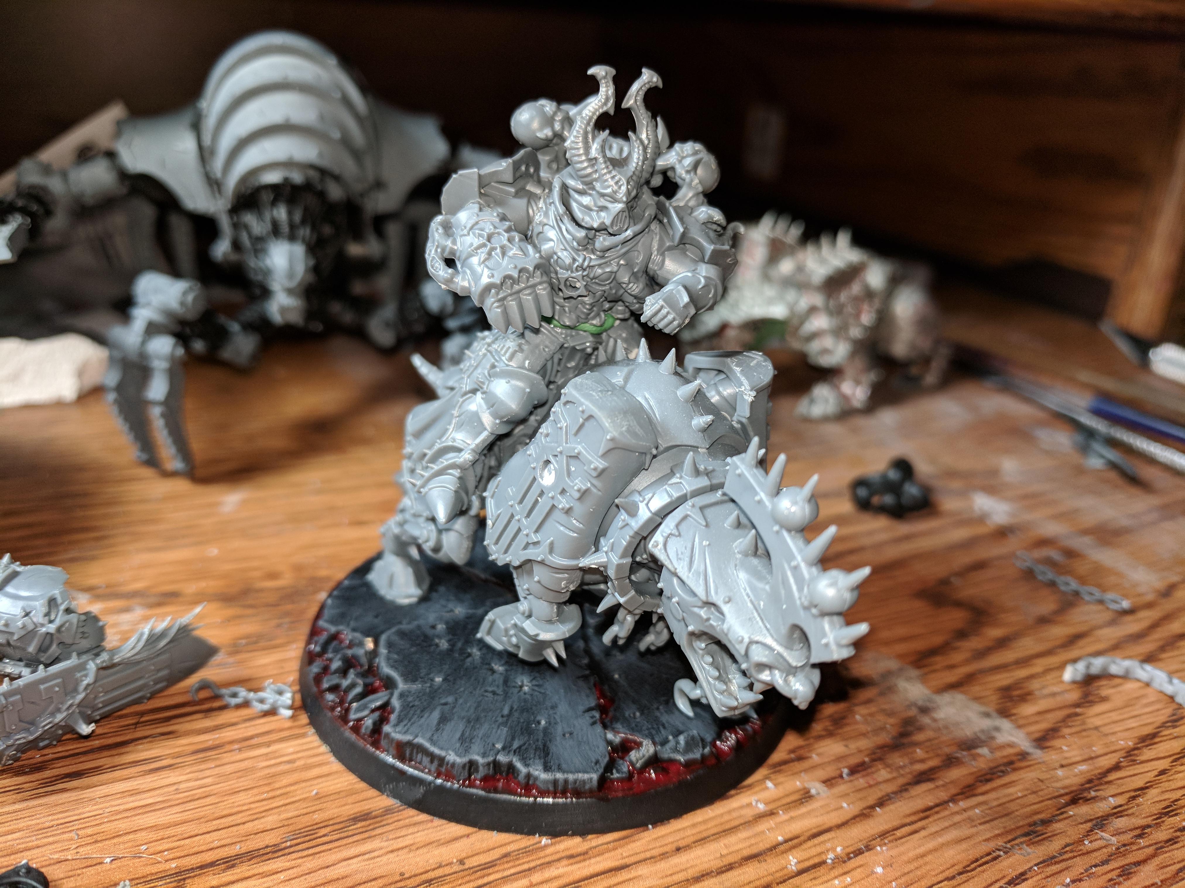 So I went bits diving at my flgs and i found a whole bloodcrusher with knight. Rather than slice up the dude for his legs I changed to using the plastic Juggernaut to make the whole thing plastic. I'm gonna finish the metal one with a different dude. Here's the progress. I need to do some more green stuff work around the hip area and add the chain to the non power fist hand to the collar. A few things here and there and it'll be paint ready.