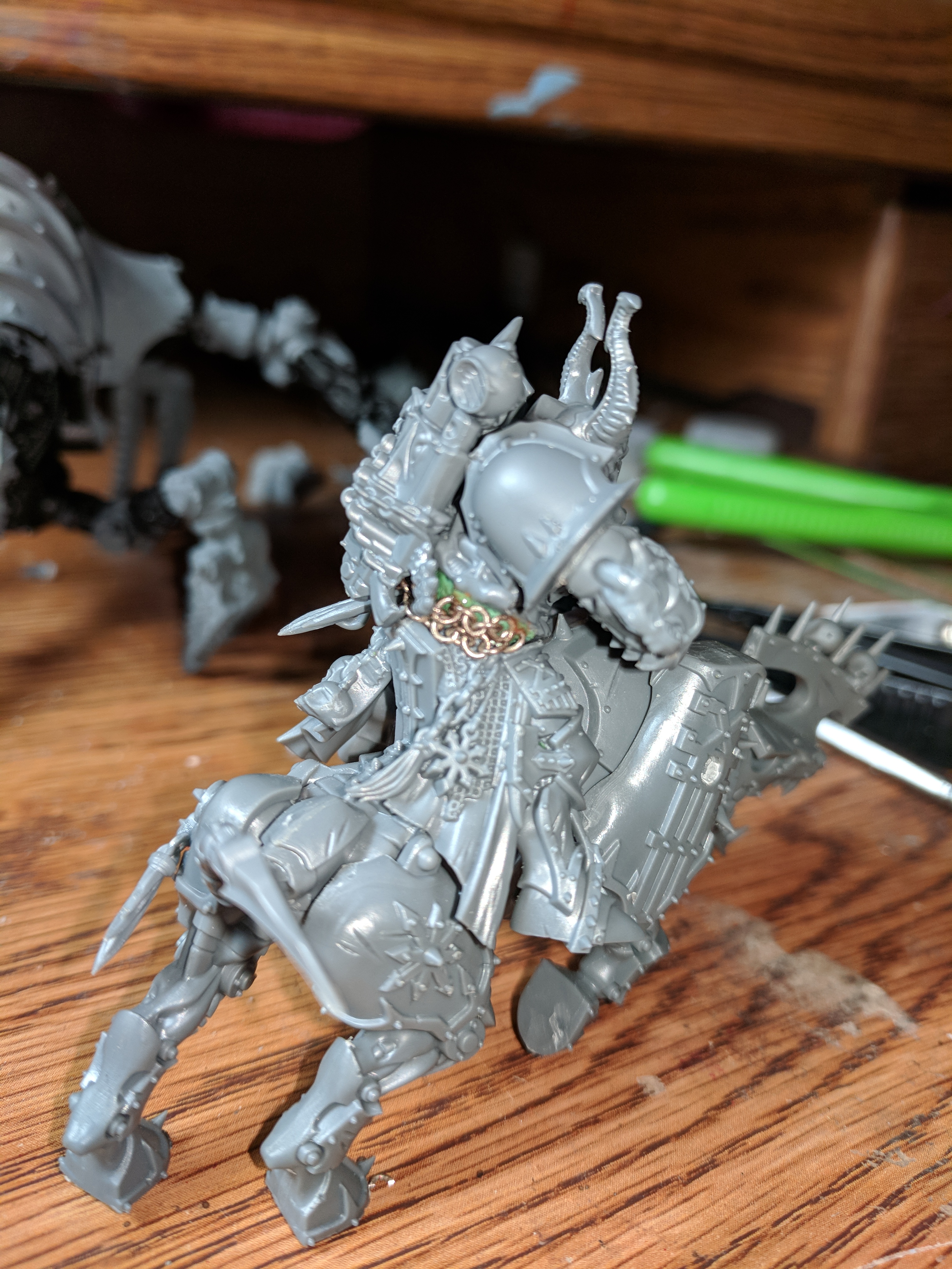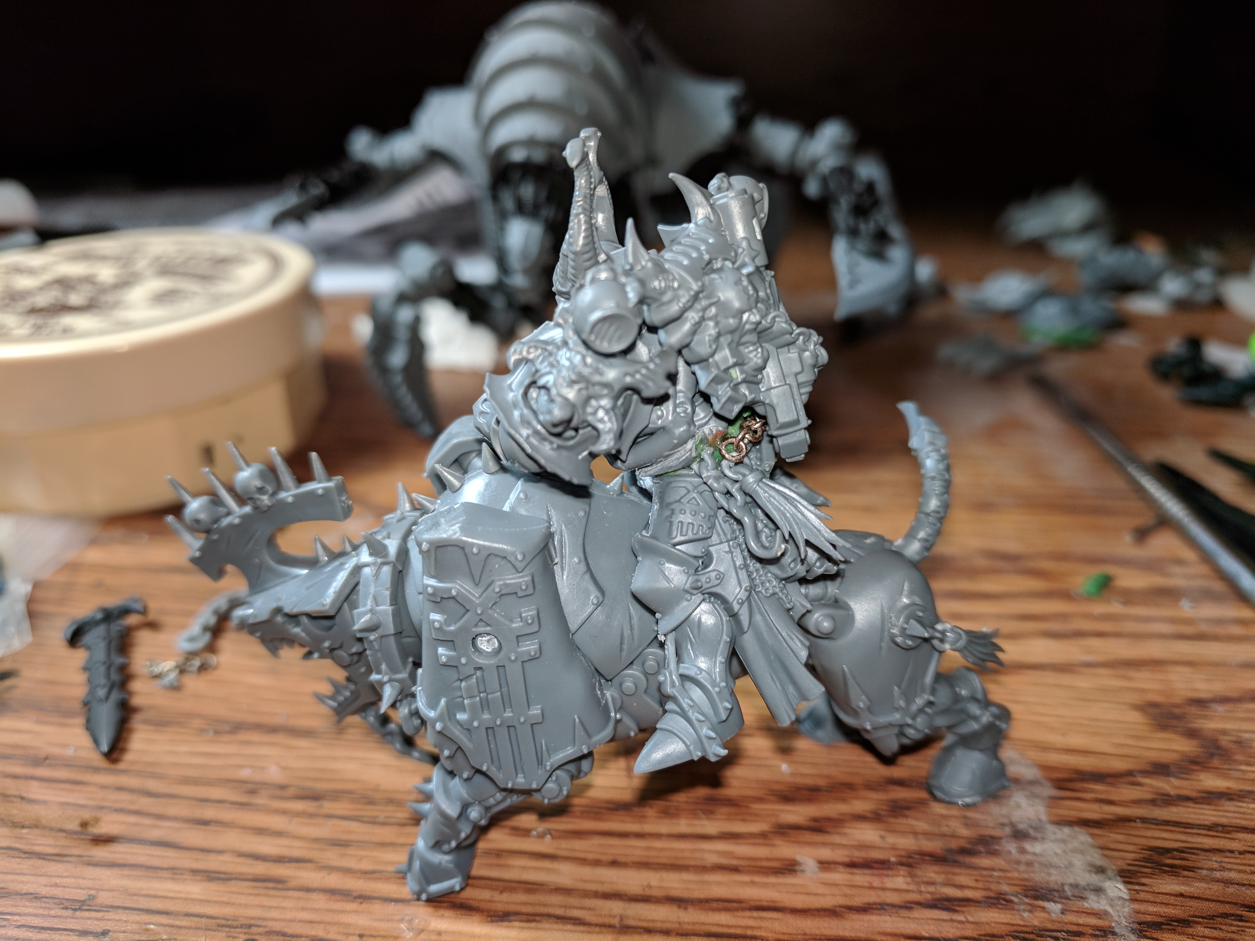 I remember that one. A large portion of the Juggernaut itself was re-sculpted to accommodate the new pose. The base of the lord model is half Archaon (the old one on the horse) and an obliterator's legs. The Axe arm is from Grimgor Ironhide while the other one is a power fist.