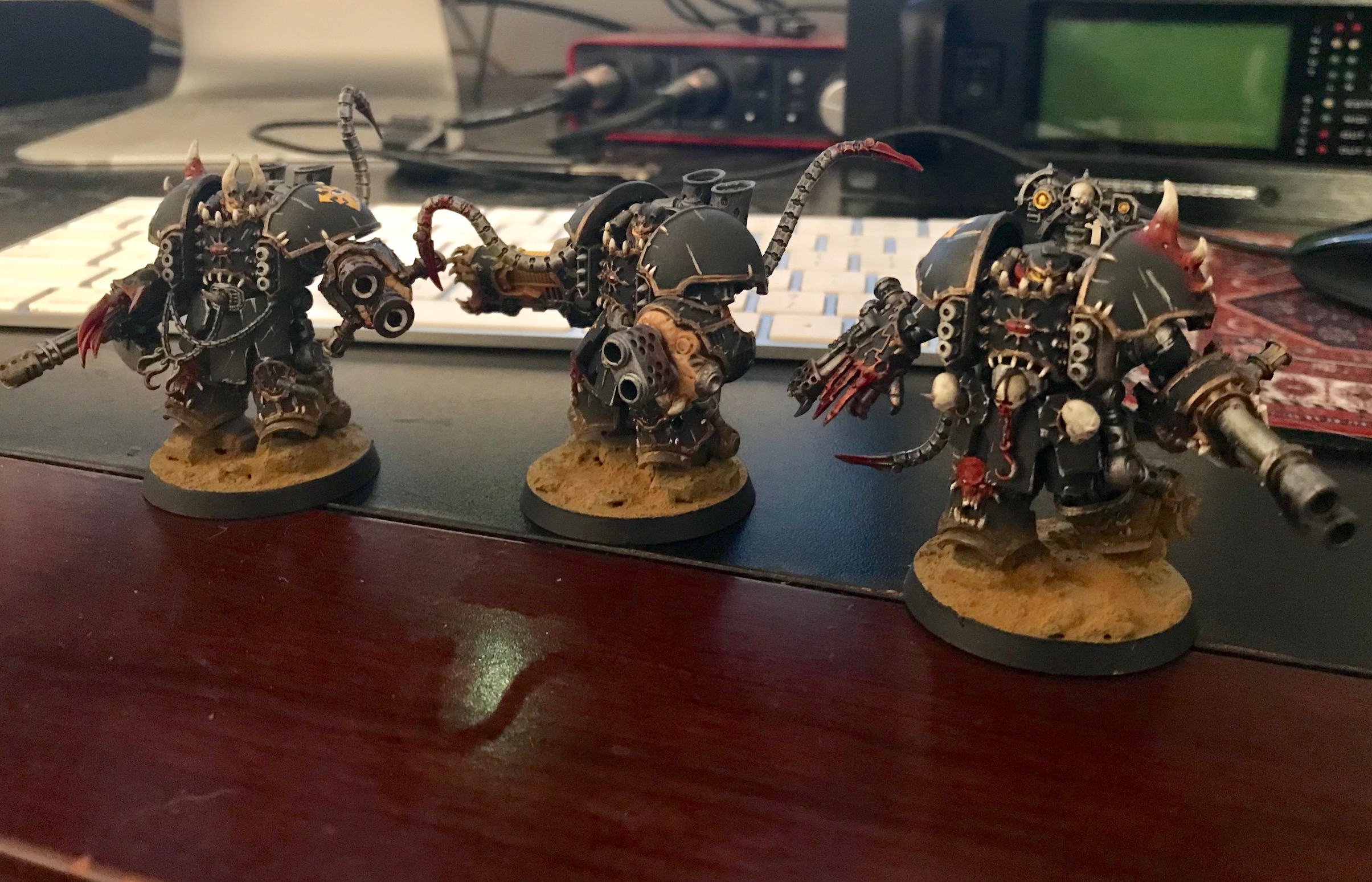 I'm really not a fan of the melty-cheese terminators, and wanted to have big hulking brutes wielding powerful daemon weapons. With the changes to 8th's obliterator weapons, they work even better now that they aren't specifically shooting melta/las/ plas/flamers.