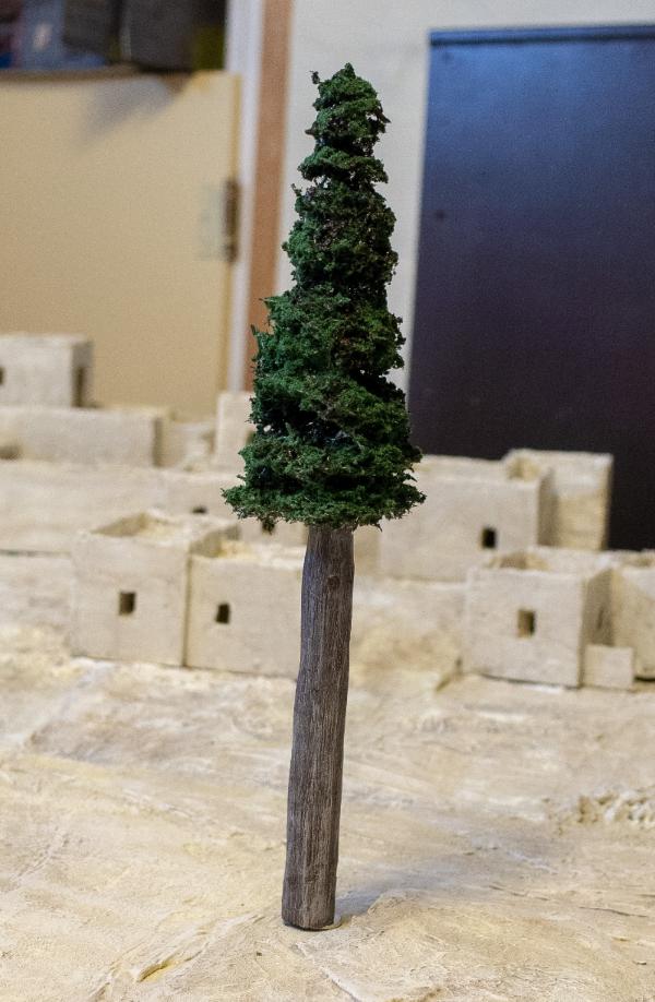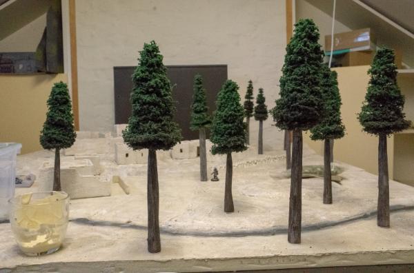 I think I got this tree thing down. More suitable spray glue made for much nicer foliage in my first batch of trees, and for my second batch I got the shapes and sizes more to my liking. I think I have about half the trees I need now.
