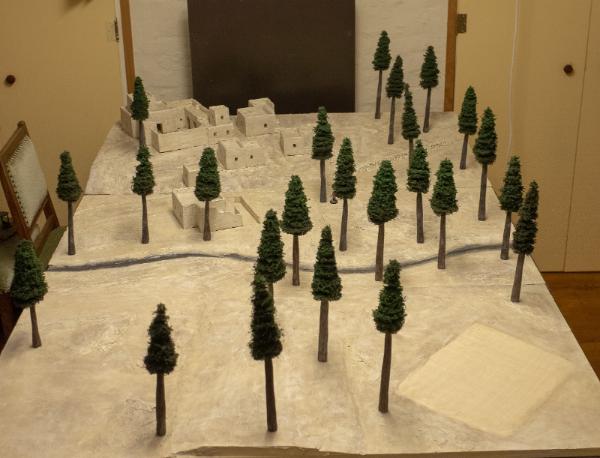 I've set my battle reports on the planet Asper so far, so I'll situate the new terrain on that same planet. I decided there is a "Kakamba peninsula" somewhere on Asper, featuring various points of interest and also a point of not so much interest: the backwoods town of Sirsi. Not very developed, small, on the outskirts of a small pine forest bordering a mountainous region. The people of Sirsi do some farming, some mining and other basic stuff and some illicit trading. They're also near a spot chosen by the Karist Enclave as the site for one of their secret bases. There's a white arrow and circle on the map to point out the not so precise location.
