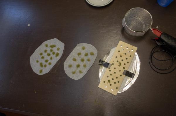 Several things I mean to improve, mostly the glue I used. This spray glue I have didn't quite behave as expected. First of all it shoots like a web of glue rather than a misty spray, a bit like Spider Man, and secondly it dries white. So the glue you see in the first image: don't buy that for scenery. I salvaged what I could but I figure the foliage will look a bit better with better glue.